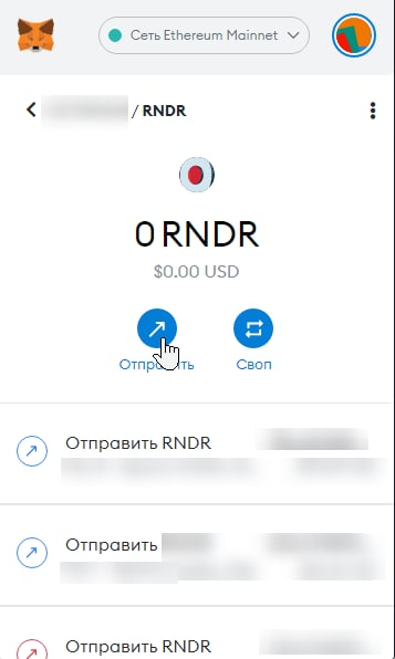 В Metamask делаем перевод RNDR токенов, указав адрес кошелька криптобиржи (3).
