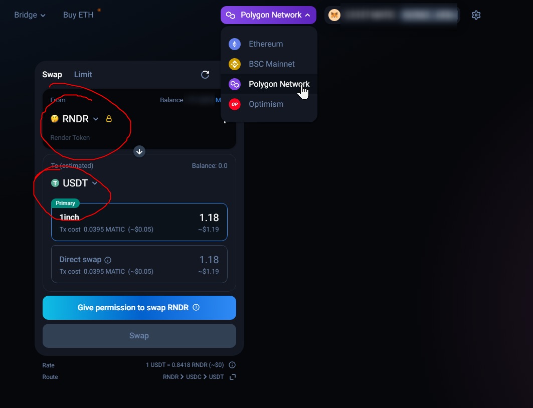 - На примере DEX 1inch делаем обмен RNDR Токенов на USDT/USDC стейблкоин (предварительно переключив сеть в Метамаске и обменнике на Polygon)