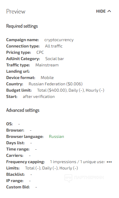 Скрин из партнёрки: