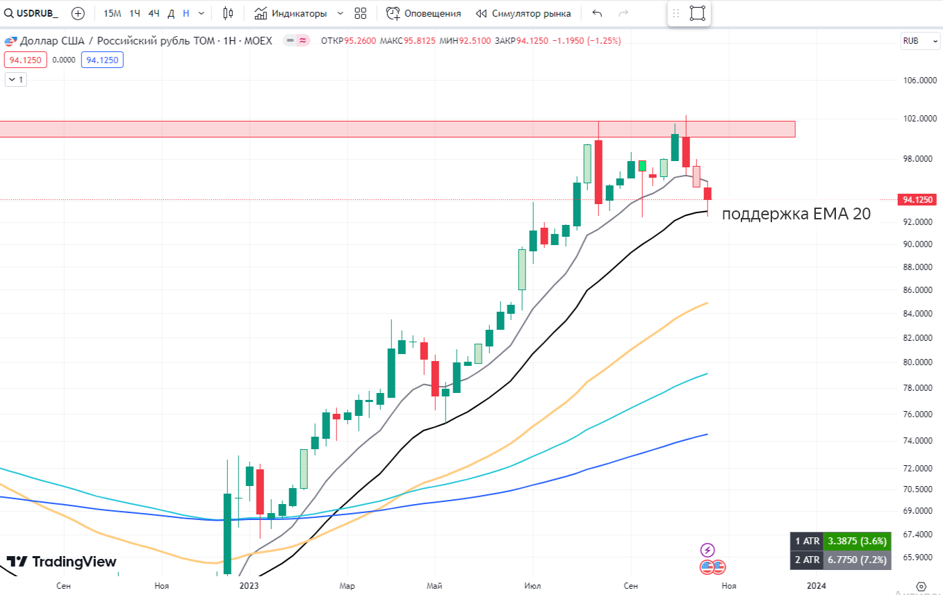 Снова попадание от нас на предыдущей неделе. Идеально отскочили от ЕМА 20 на недельном графике в районе 93 рубля за доллар. О развороте говорить очень рано, ведь на дневном графике мы выпали из тренда (ниже ема 10/20)