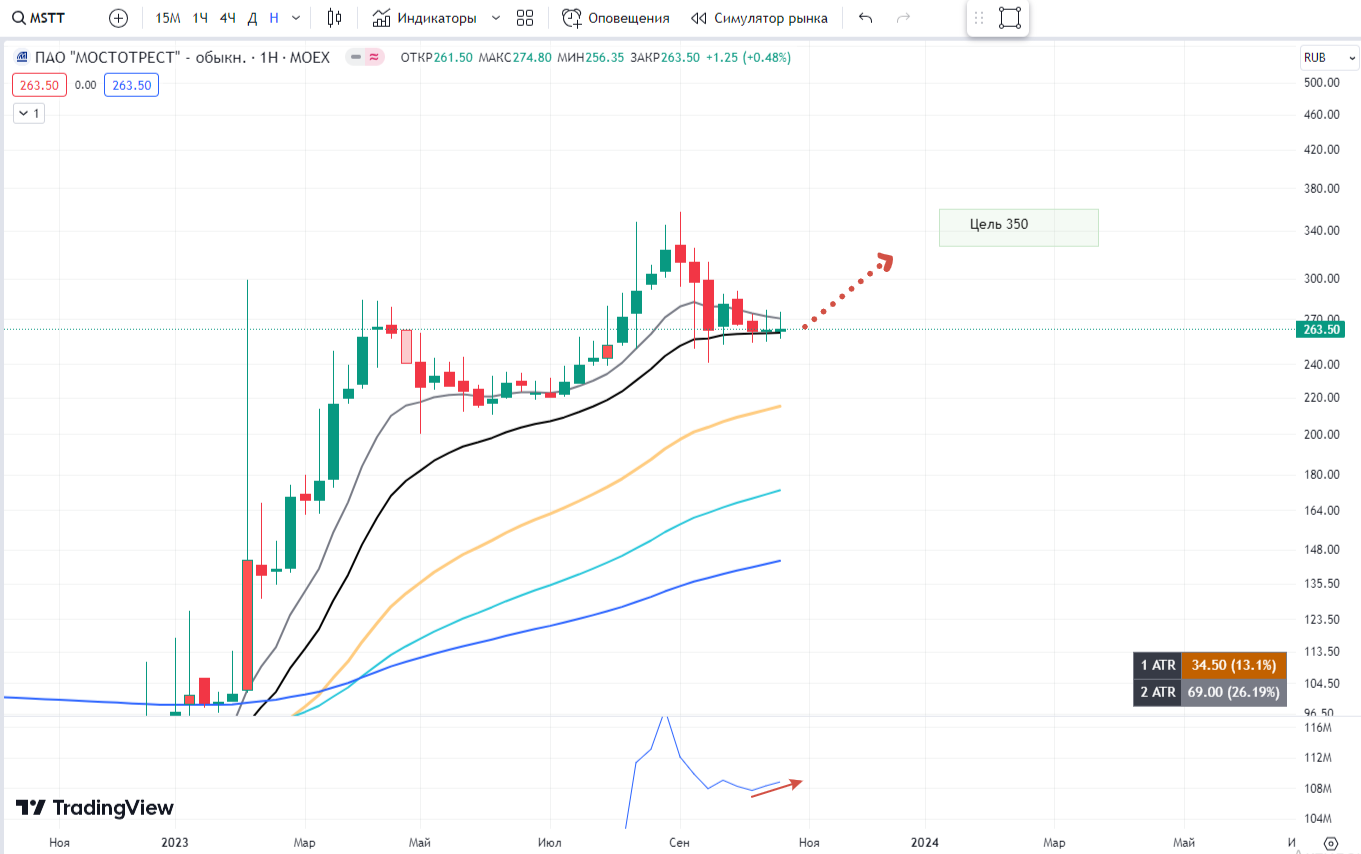 в течении шести недель накапливает объемы у ЕМА 20. Последние свечи предполагают отсутствие продавцов. Цель: предыдущий хай 350.