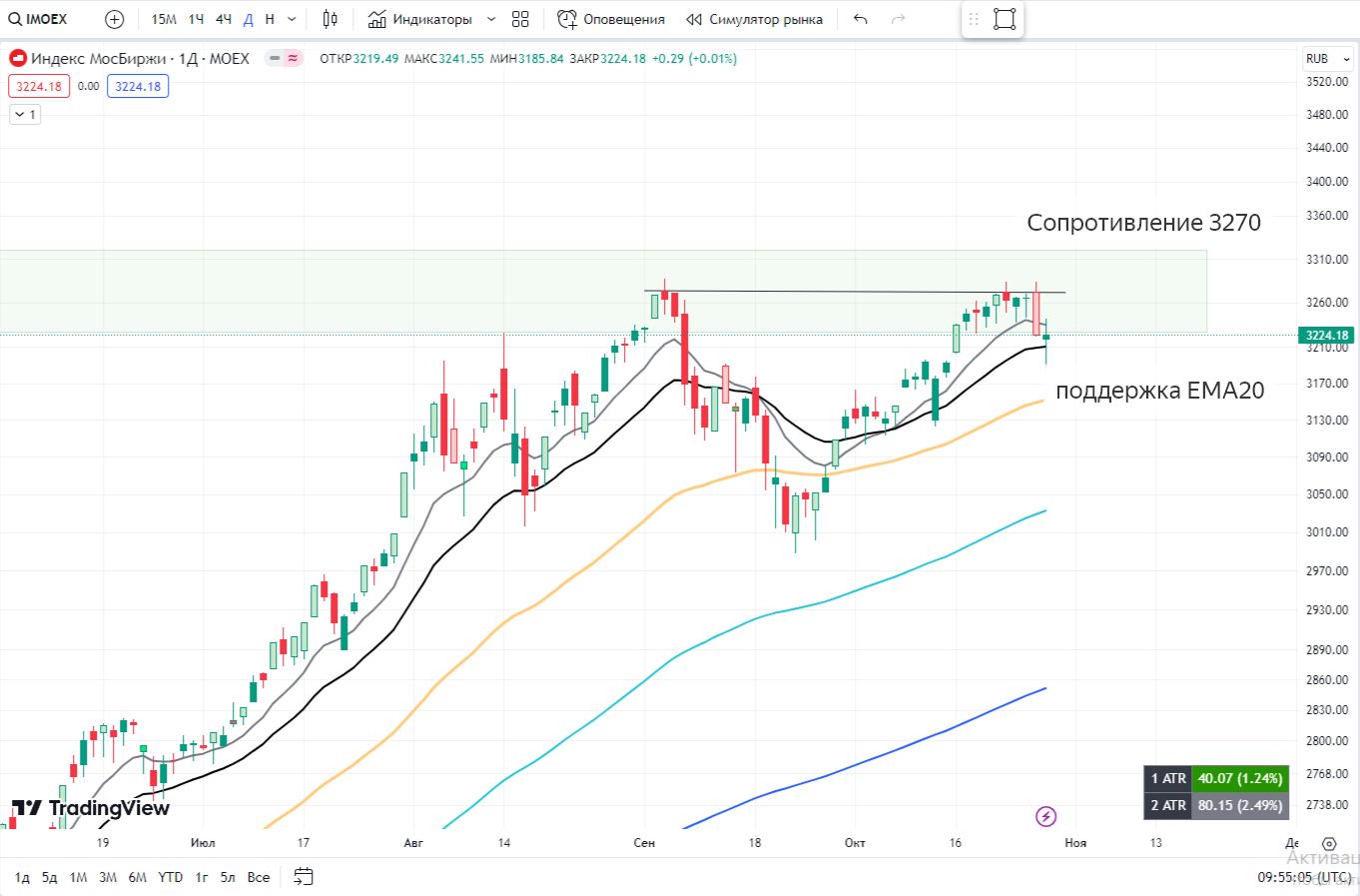 Simple Trading📌 IMOEX всю неделю консолидировался у предыдущего хая, ожидая данные по ставке ЦБ. Рынок, закладывал меньшую ставку, отчего полетел вниз. На предыдущей неделе мы идеально точно указали сопротивление и поддержку рынка. На данный момент “показательно” закрылись выше ЕМА 20. Насколько это бычий тренд? Давайте разбираться.