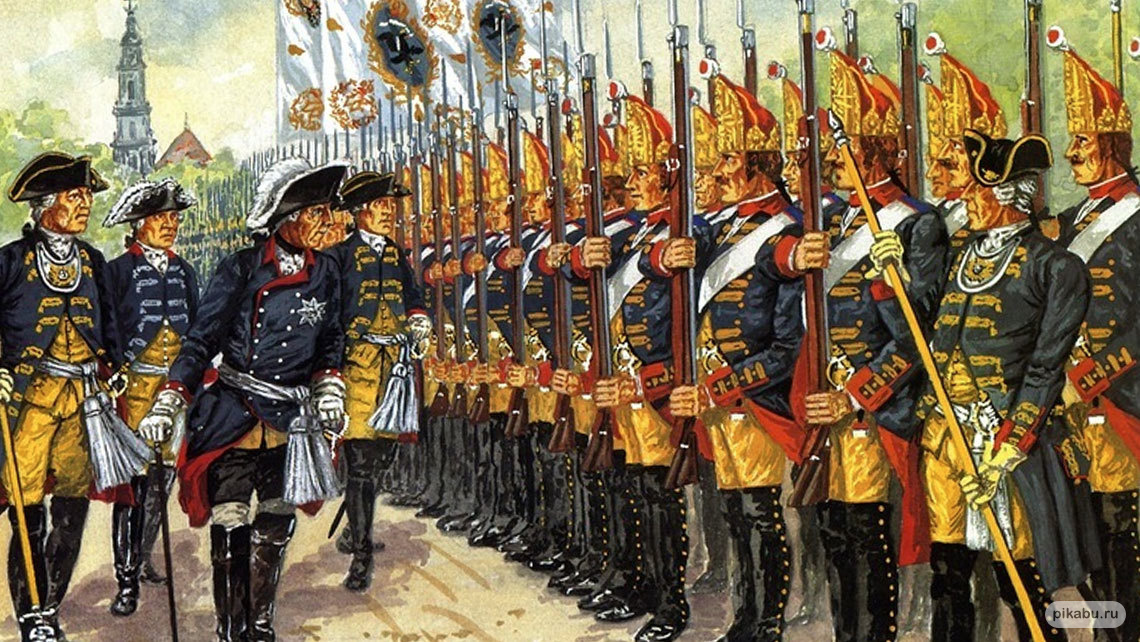 Однако при помощи муштры и тотального подавления воли каждого солдата добиваться побед становилось всё труднее. Да, Фридрих воевал удачно, пусть в итоге был разгромлен союзниками в итоге Семилетней войны 1756-1763 годов (от уничтожения Пруссию спас Петр Третий, пришедший в конце войны к власти фанат Фридриха), но на эти тревожные звонки внимания никто не обратил. Прусская армия превращалась в малоспособные парадные полки, которые умели только шикарно маршировать и нести знамёна перед королём на многочисленных парадах.