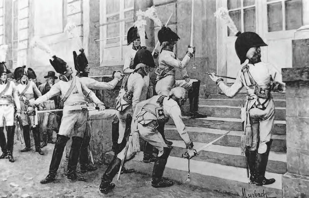 В прусской армии времён Фридриха Великого была очень тяжёлая служба, постоянная муштра, изнурительная и тупая. Каждая стойка прорабатывалась до абсурдных мелочей, например, в уставе были описаны детально положения всех (!) пальцев при стойке «смирно». Так, средний и безымянный пальцы следовало сгибать, чтобы их кончики касались пояса, руки должны быть согнуты в локтях немного и «непринуждённо» (так и было написано в уставе, это не шутка). Уже можно запутаться, а между тем это — самая простая и начальная стойка, даже без оружия. А различных приёмов и поворотов с оружием и без были десятки.