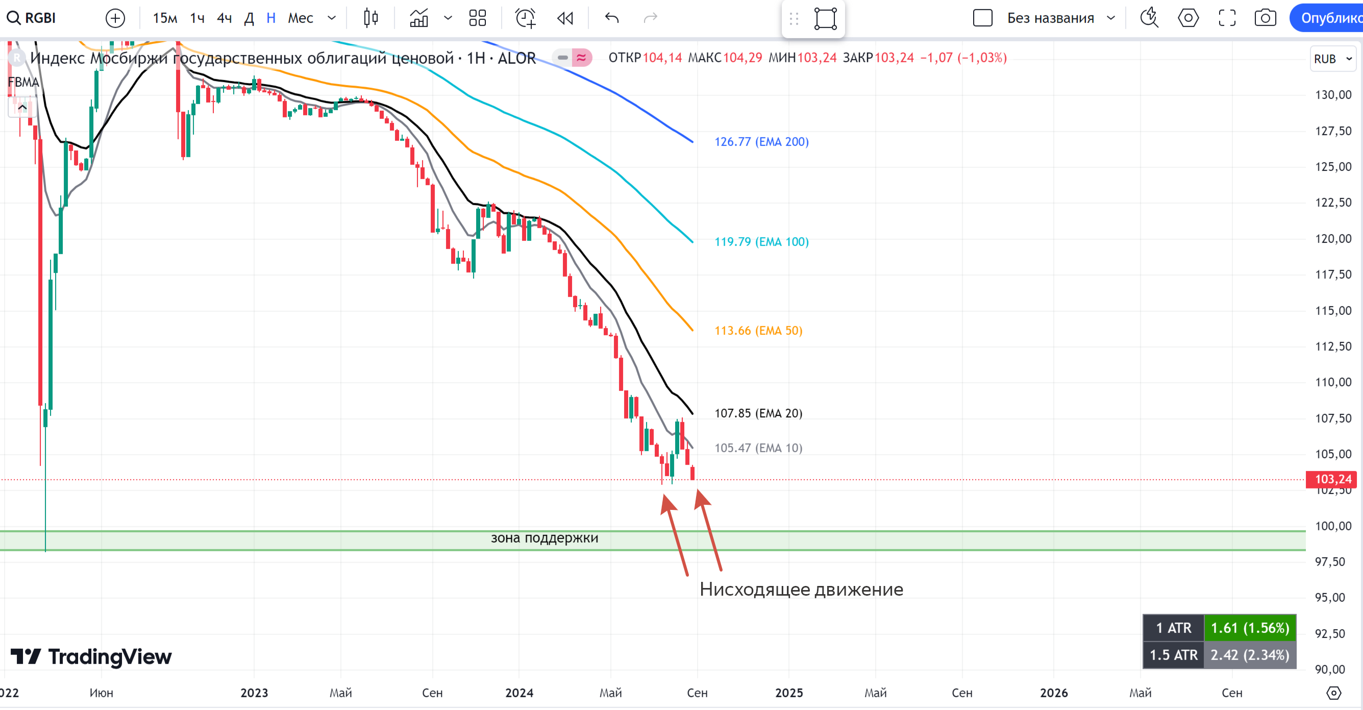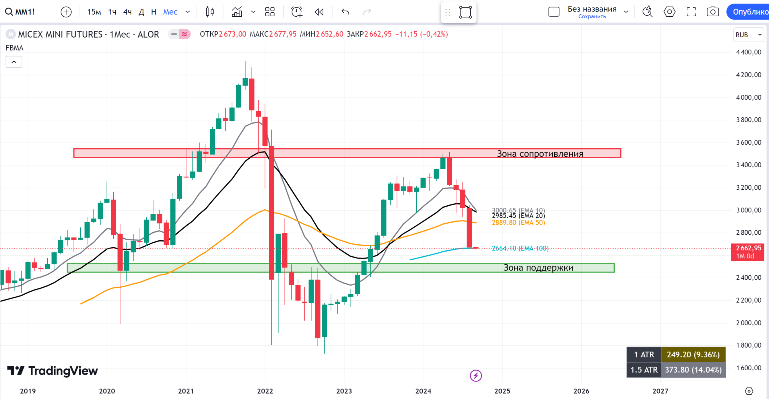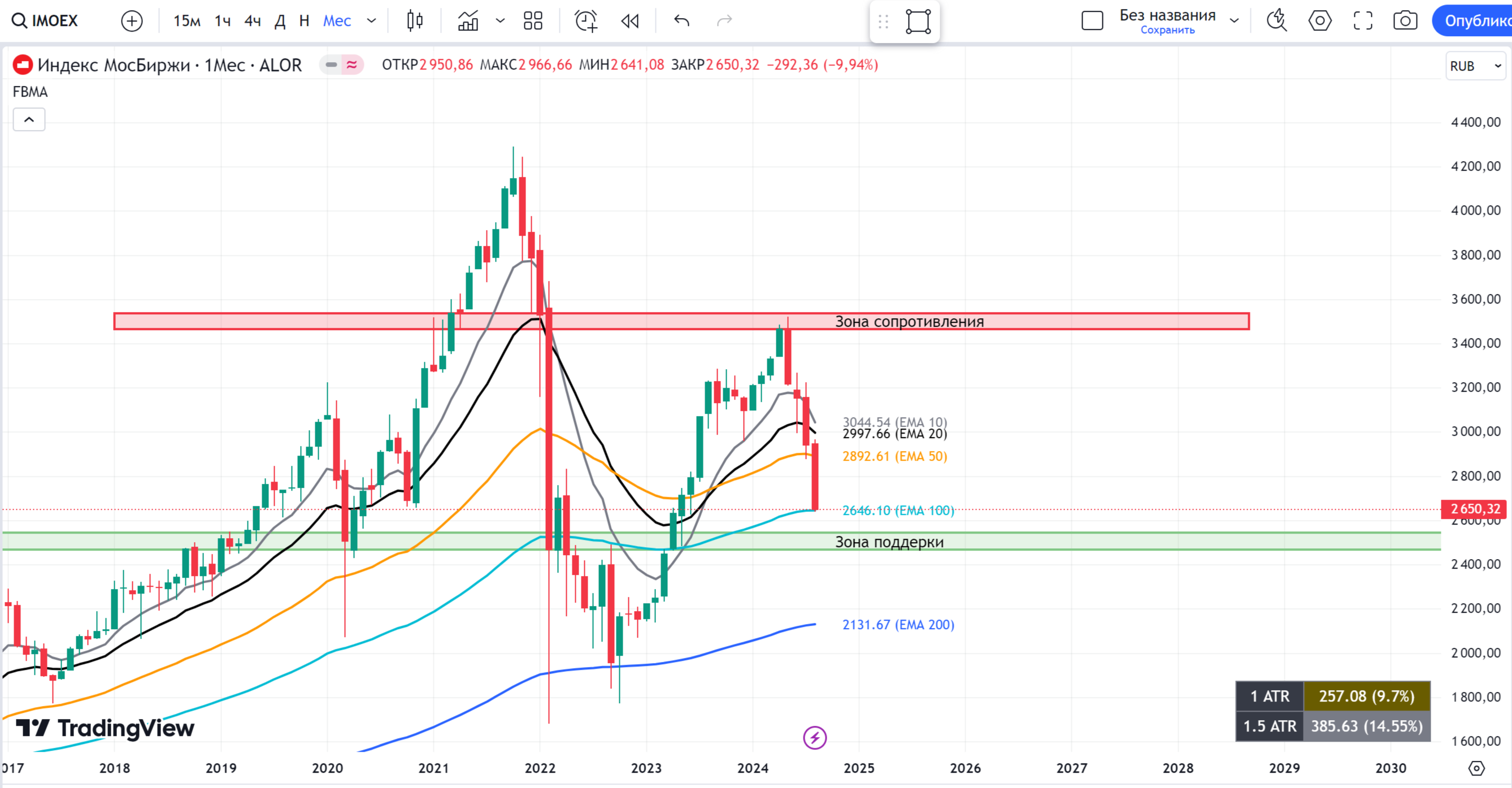 Однако акции приближаются к важной зоне поддержки — около 250 рублей за акцию. Если цена достигнет этой зоны в момент, когда индекс составит 2500 пунктов, то мы можем увидеть отскок цены вверх.