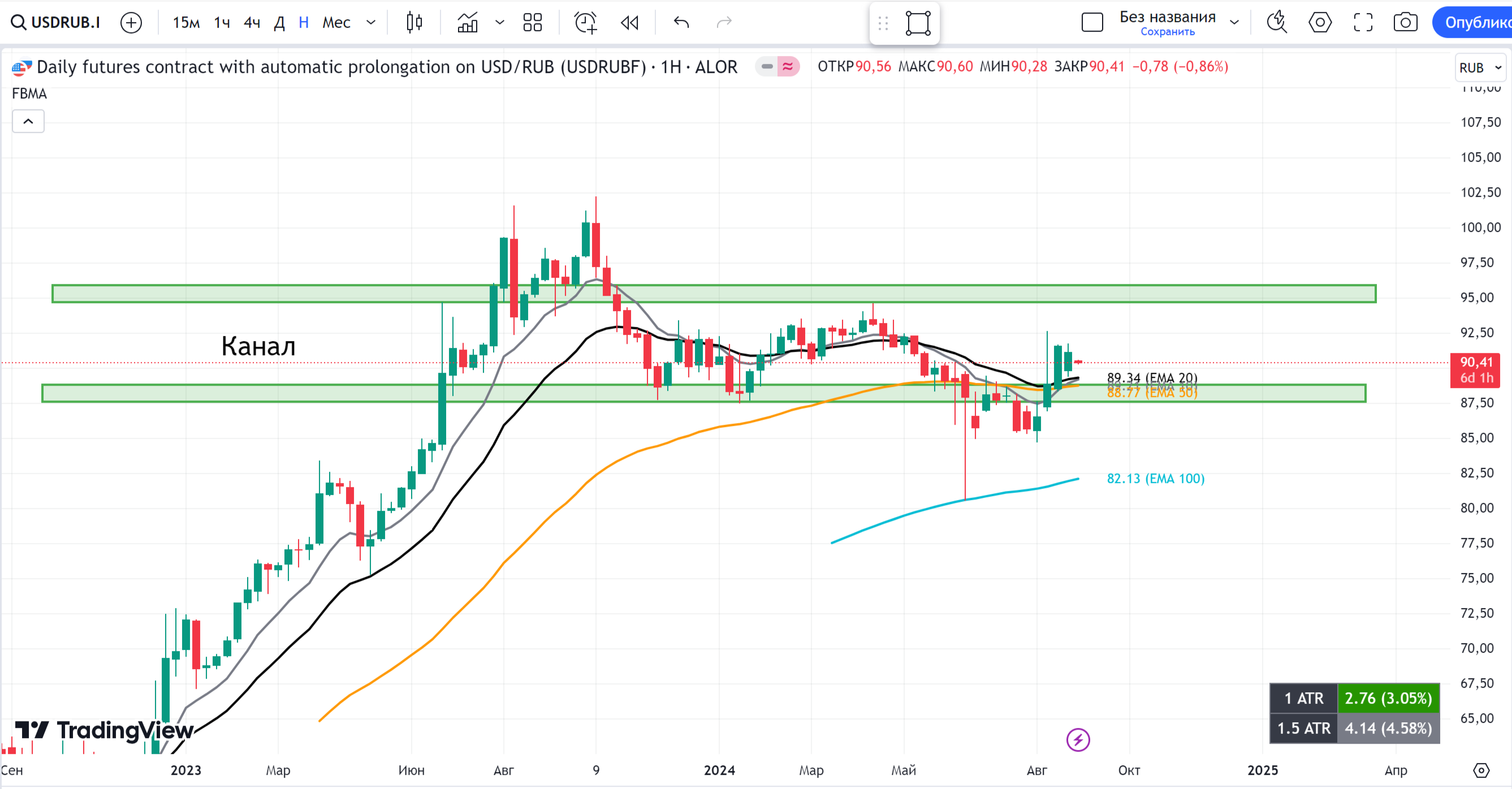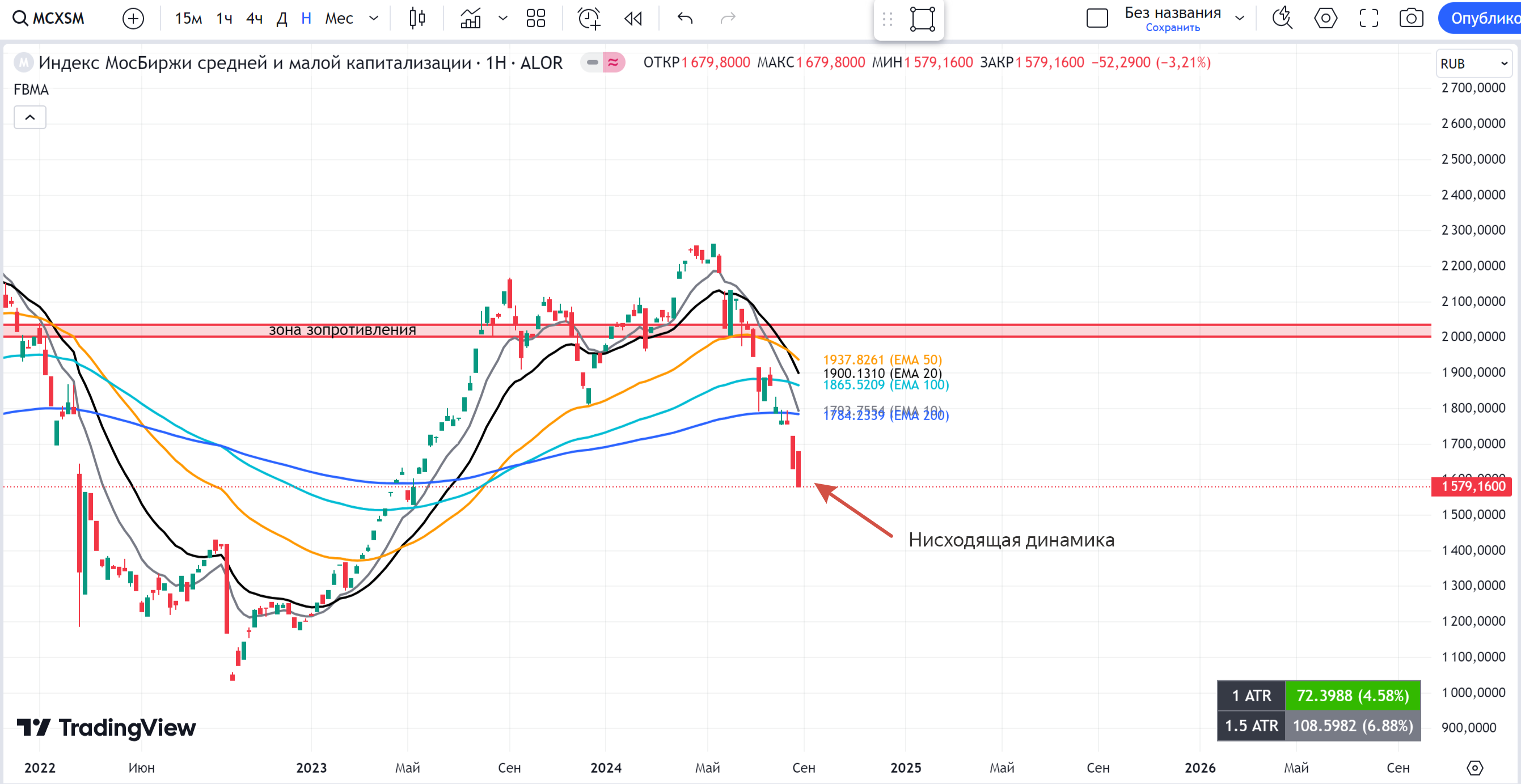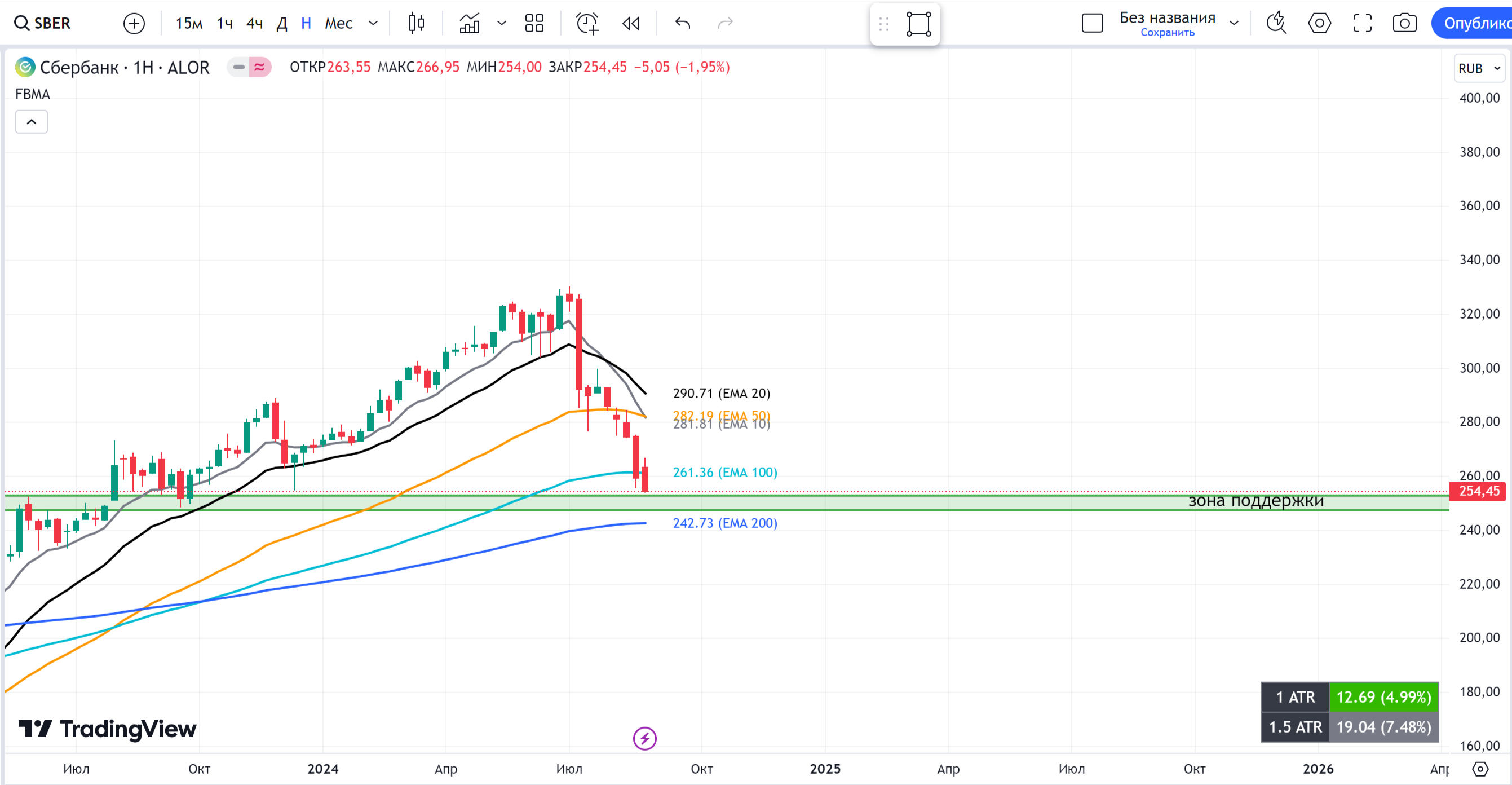 В последнее время акции Сбера демонстрируют негативную динамику на рынке. Их стоимость опустилась ниже скользящей средней ЕМА 20, что является негативным сигналом для рынка.