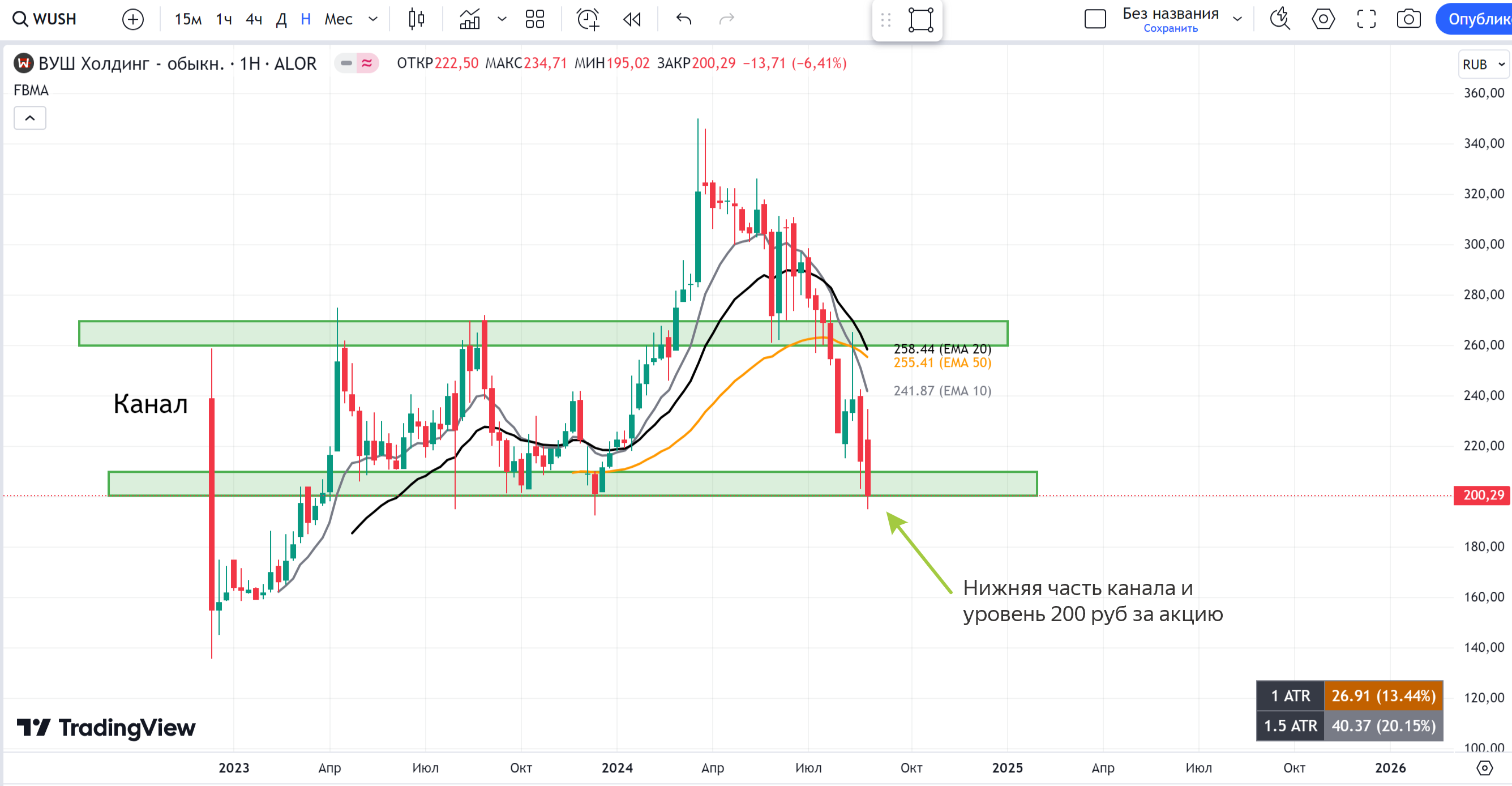 $WUSH, на хорошем отчете и поджатием к нижней части канала формируется хорошая точка входа в бумагу. На графике видно, что на этой неделе цена акций достигла важного уровня поддержки — 200 рублей за акцию. Именно по этой цене мы докупаем её акции.
