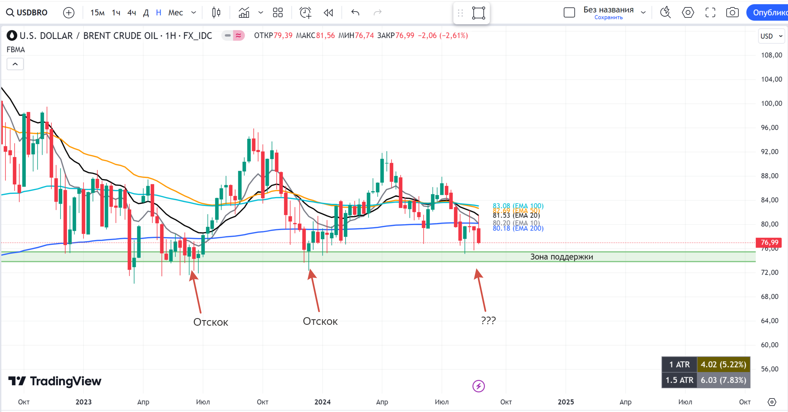 На графике наблюдаем за котировками в зоне поддержки. Именно от этой зоны нефть отскакивала уже дважды.
