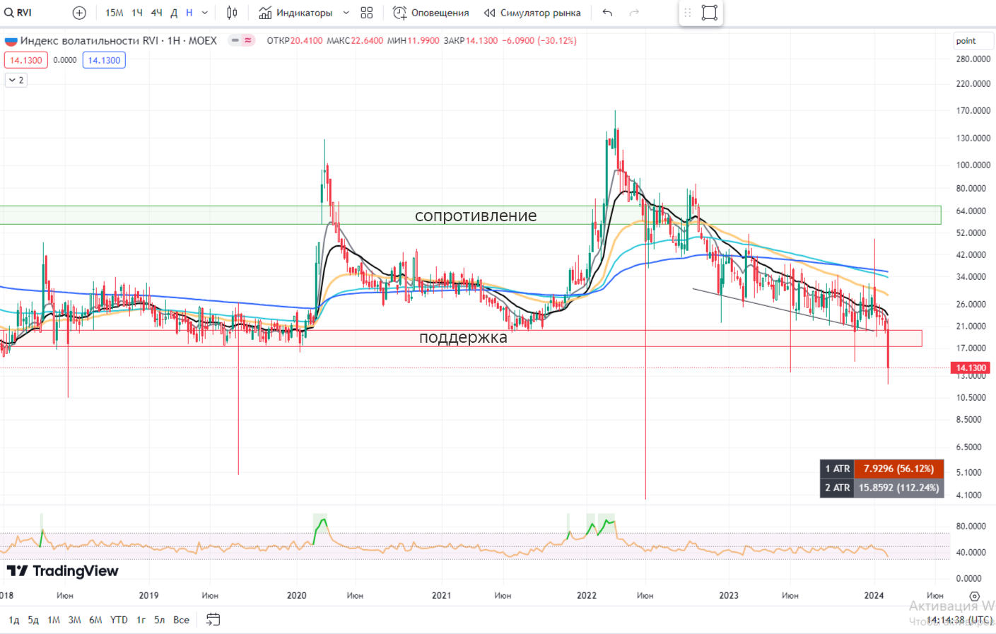 📌 RVI $VIZ3 индекс волатильности. Его рост знаменует падение рынка. Впервые за долгое время закрылись ниже поддержки. Для рынка это хороший сигнал, однако не стоит забывать, что его рост мигом скорректирует рынок.