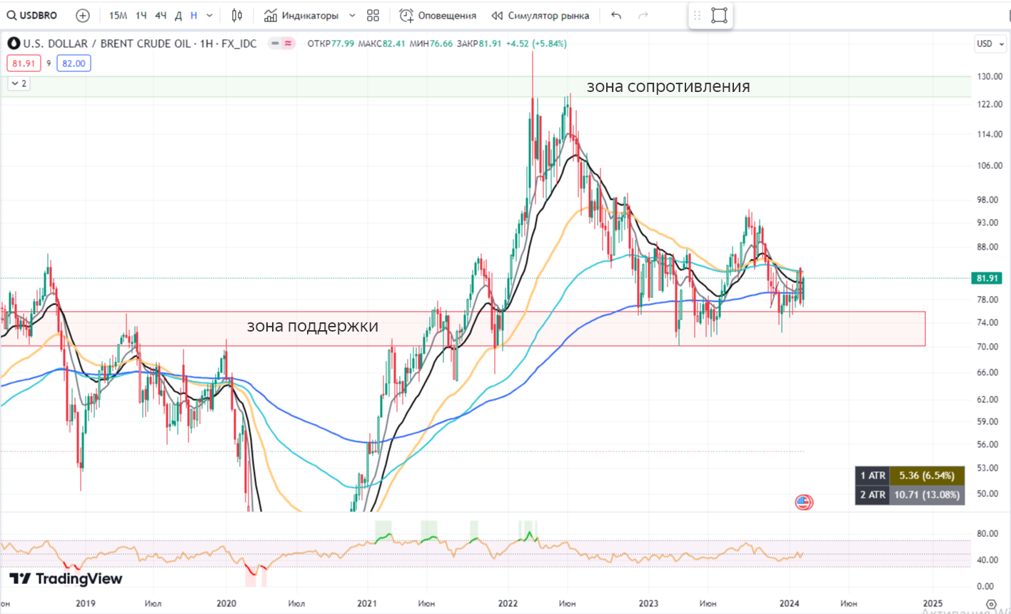 📌 USDBRO $BRF4 один из главных драйверов роста рынка, помимо доллара. Очень большая неопределенность и волатильность на рынке нефти, не дает понимание в дальнейших событиях. Мы видим, как игроки покупают нефть ниже 80 долларов за баррель.