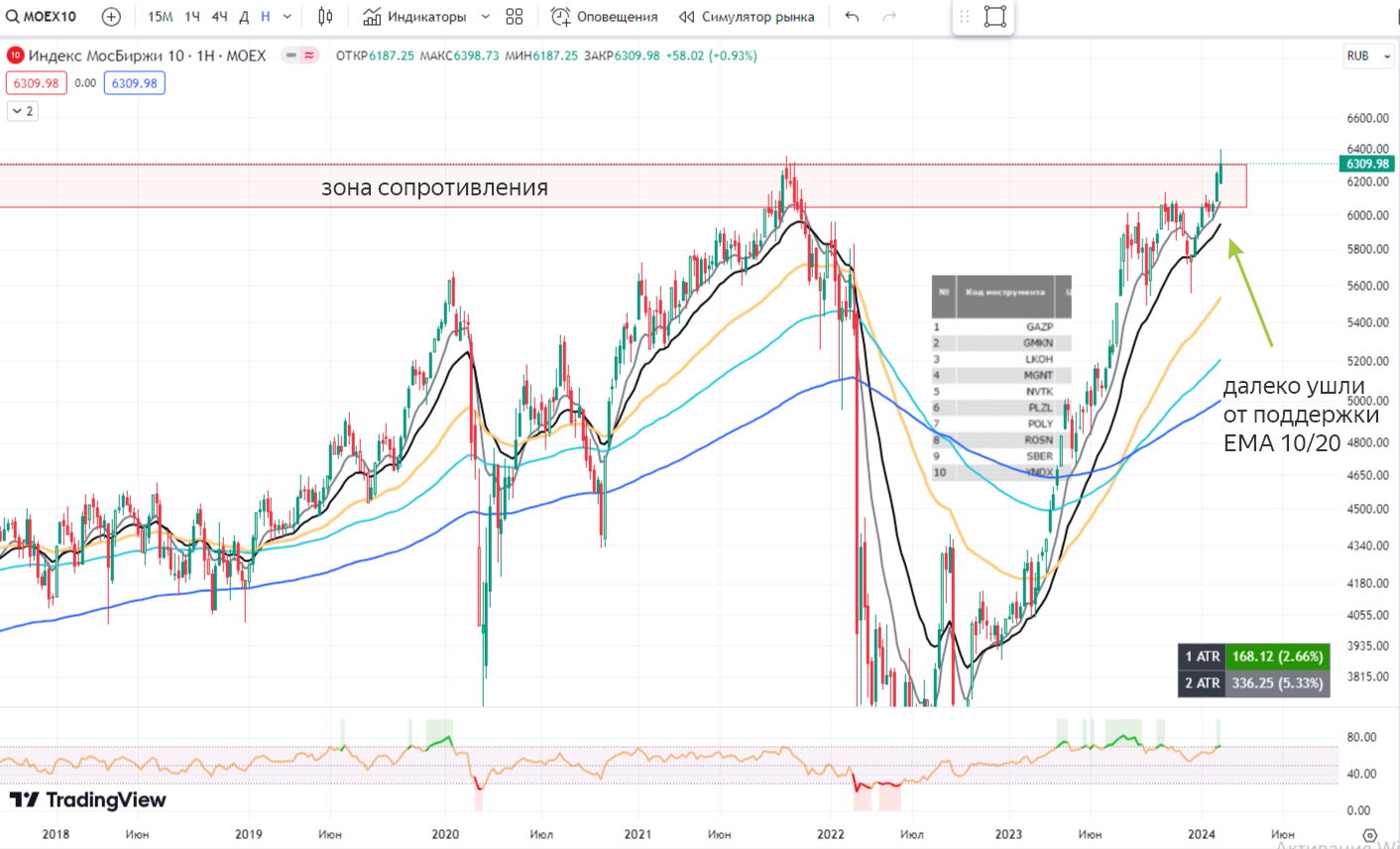 📌 MOEX10 - топ 10 компаний по капитализации. Снова сильнее рынка, но под конец недели корректировались, не пробив зону сопротивления. В целом, мы видим явный тренд на рост крупный компаний - это может быть дополнительным стимулом роста рынка. Однако, мы слишком далеко ушли от своих скользящих и перегретость на лицо.