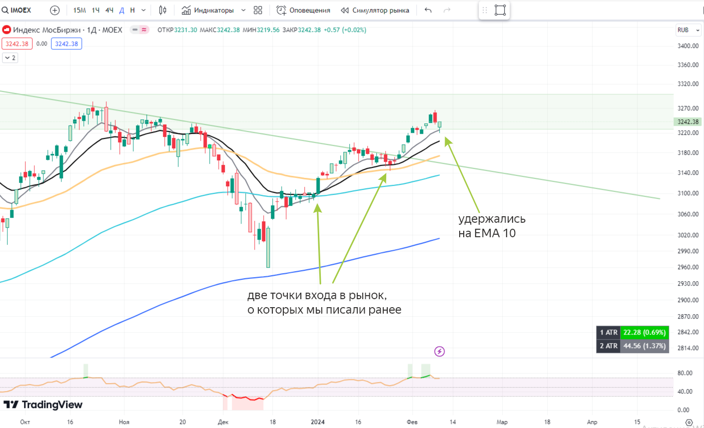 Простая Торговля📌 IMOEX, снова растет и снова подошел к зоне сопротивления. В пятницу, мы удержались на ЕМА 10, ждем подтверждения входа следующими свечами. На скриншотах показали те самые две точки входа, по которым уже заходили в рынок и писали в канале. Посмотрим что скажут наши ключи: