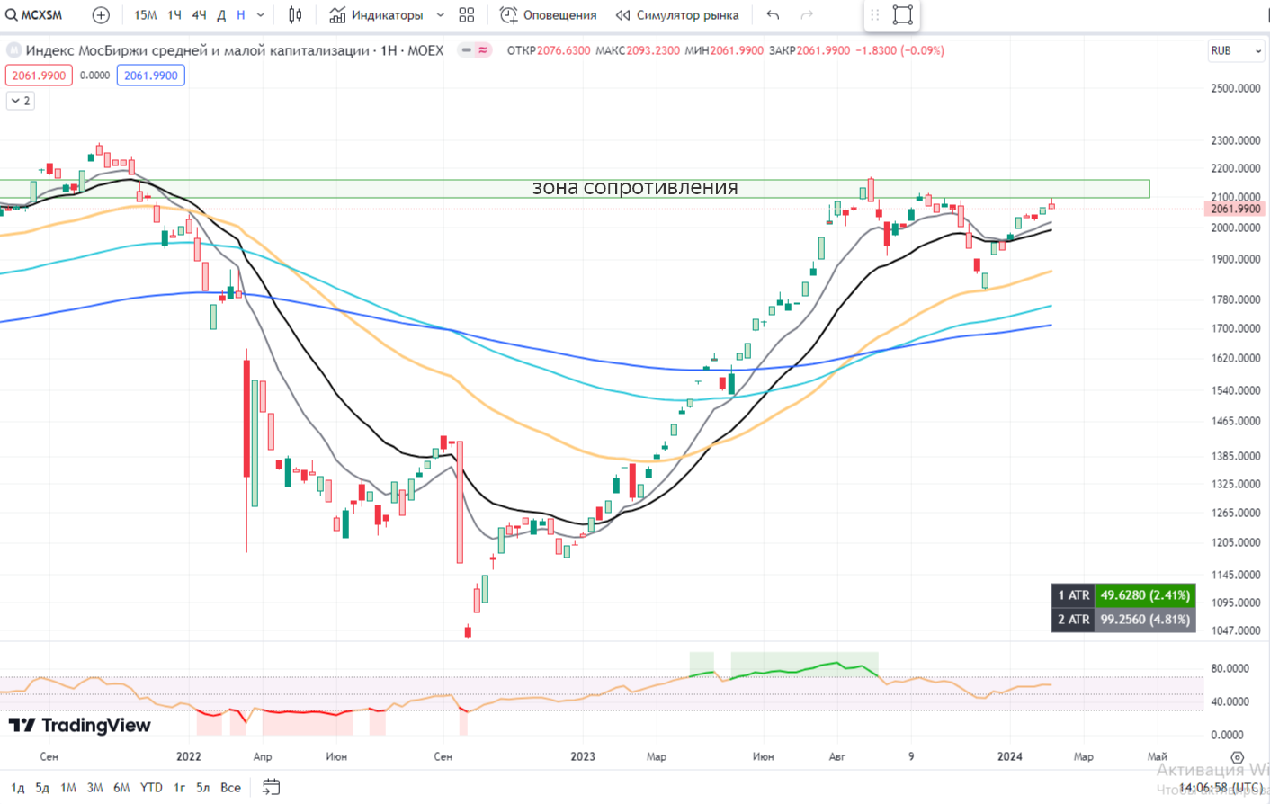 📌 MCXSM - индекс компаний малой капитализации. Маленькие компании дошли до зоны сопротивления и в моменте отскочили ниже. MCXSM - это опережающий индекс, следим внимательно за движением котировок у зоны сопротивления.
