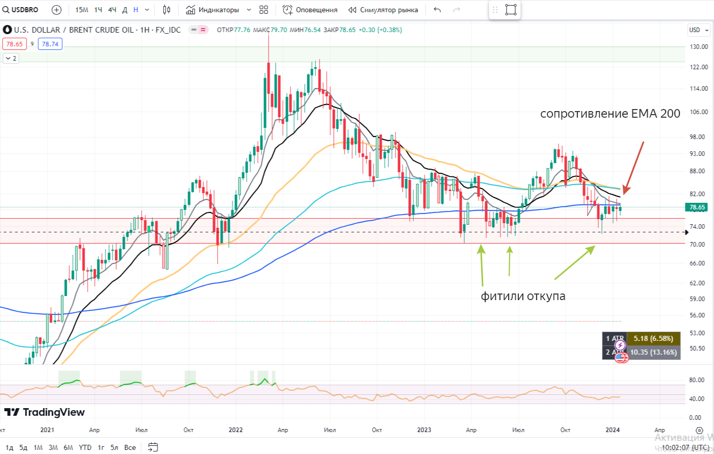 📌 USDBRO $BRF4 один из главных драйверов роста рынка, помимо доллара. На рынке нефти продолжается волатильность на фоне эскалации конфликта в мире. Одно можно сказать точно: фитили, что мы видим в районе 70, говорят о накоплении объемов у покупателей. Внимательно следим за лонг идеей. А пока, мы ниже трендовой ЕМА 200.