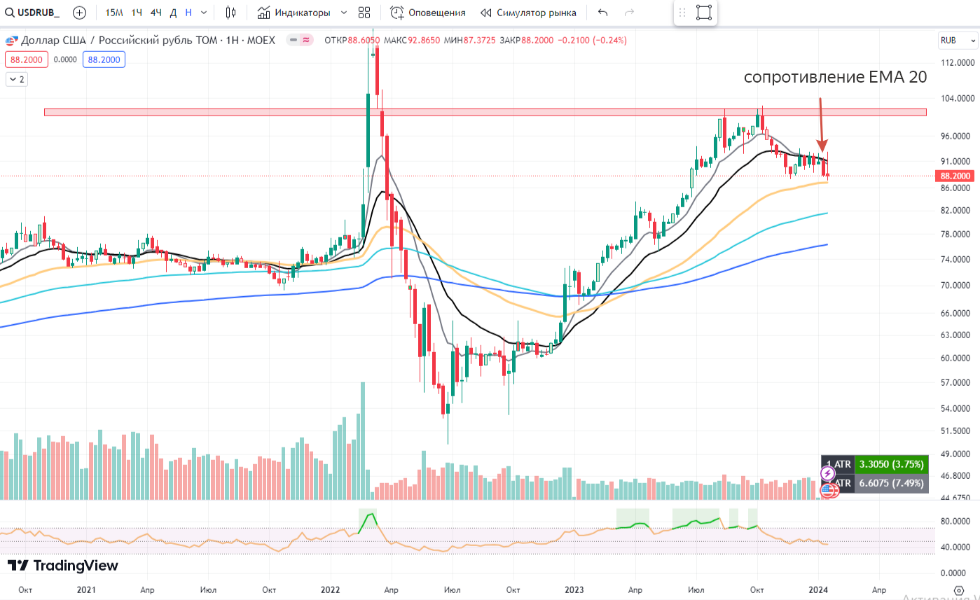 📌 $USDRUB продолжает быть в нисходящей тренде. Очередная попытка пробить ЕМА 20 на недельном графике, и вновь безуспешна. Продолжаем стоять в шорт.