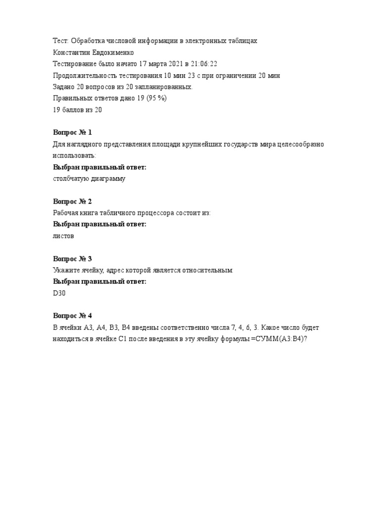 Тест с ответами "Табличный процессор . Основные сведения . . .