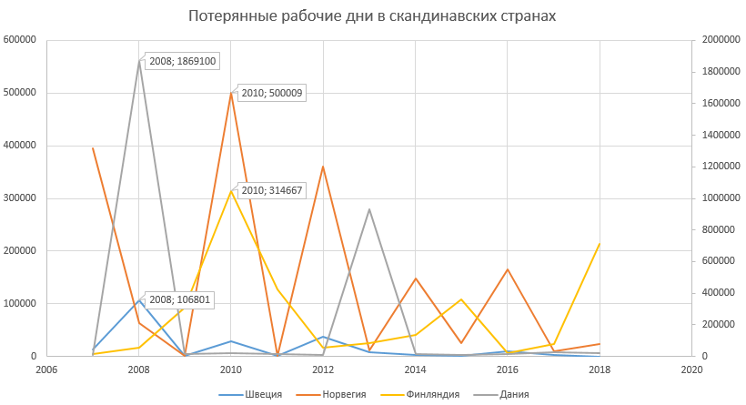 К примеру, 7527 рабочих дней были потеряны в Швеции в прошлом году из-за забастовочных мероприятий. Для сравнения: 10417 дней в 2016 году, 2570 дней в 2017 году, 50 рабочих дней в 2018. А пик забастовок за последние 10 лет пришёлся как и в Дании на 2008 год. Источник Отчёт