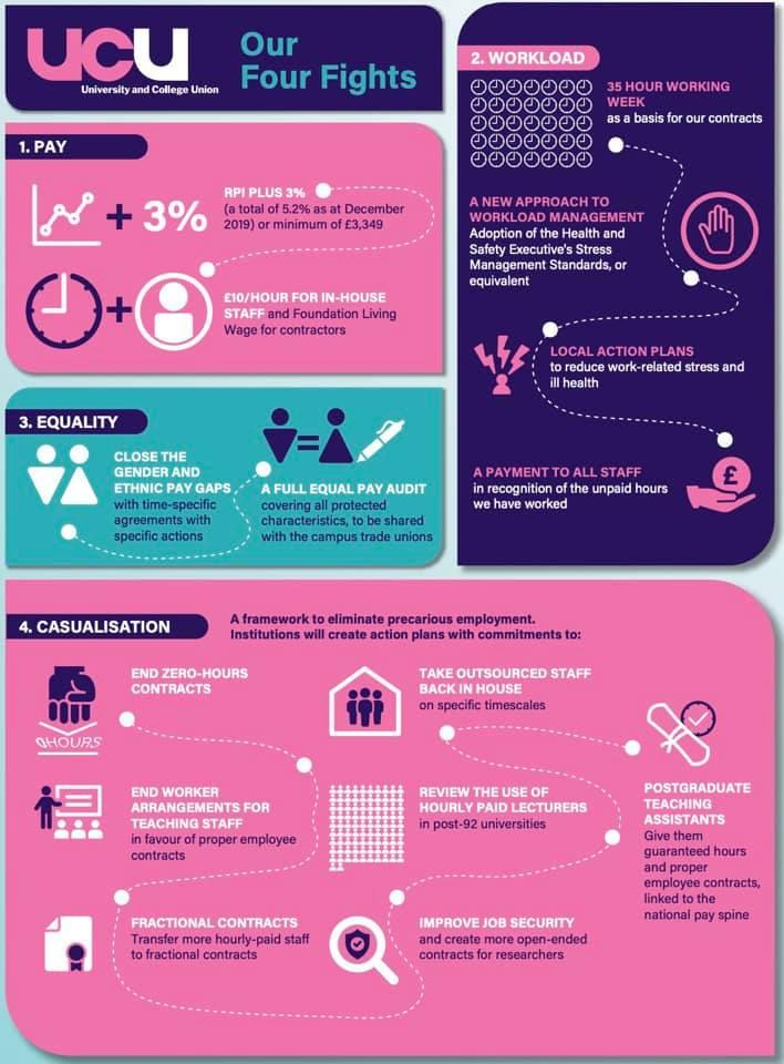 До 50 000 лекторов, техников, библиотекарей и другого научного и вспомогательного персонала из 74 университетов примут участие в забастовке общей продолжительностью 14 дней, которая пройдет в феврале и марте. Забастовка может затронуть около 1,2 миллиона студентов. Многие студенты выразили свою поддержку персоналу, но настаивают на компенсации со стороны руководителей университетов. Требования выставляются различные: повышение заработной платы, нормальные трудовые контракты вместо "нулевых" и т.д. Организатор забастовки Союз университетов и колледжей (UCU).