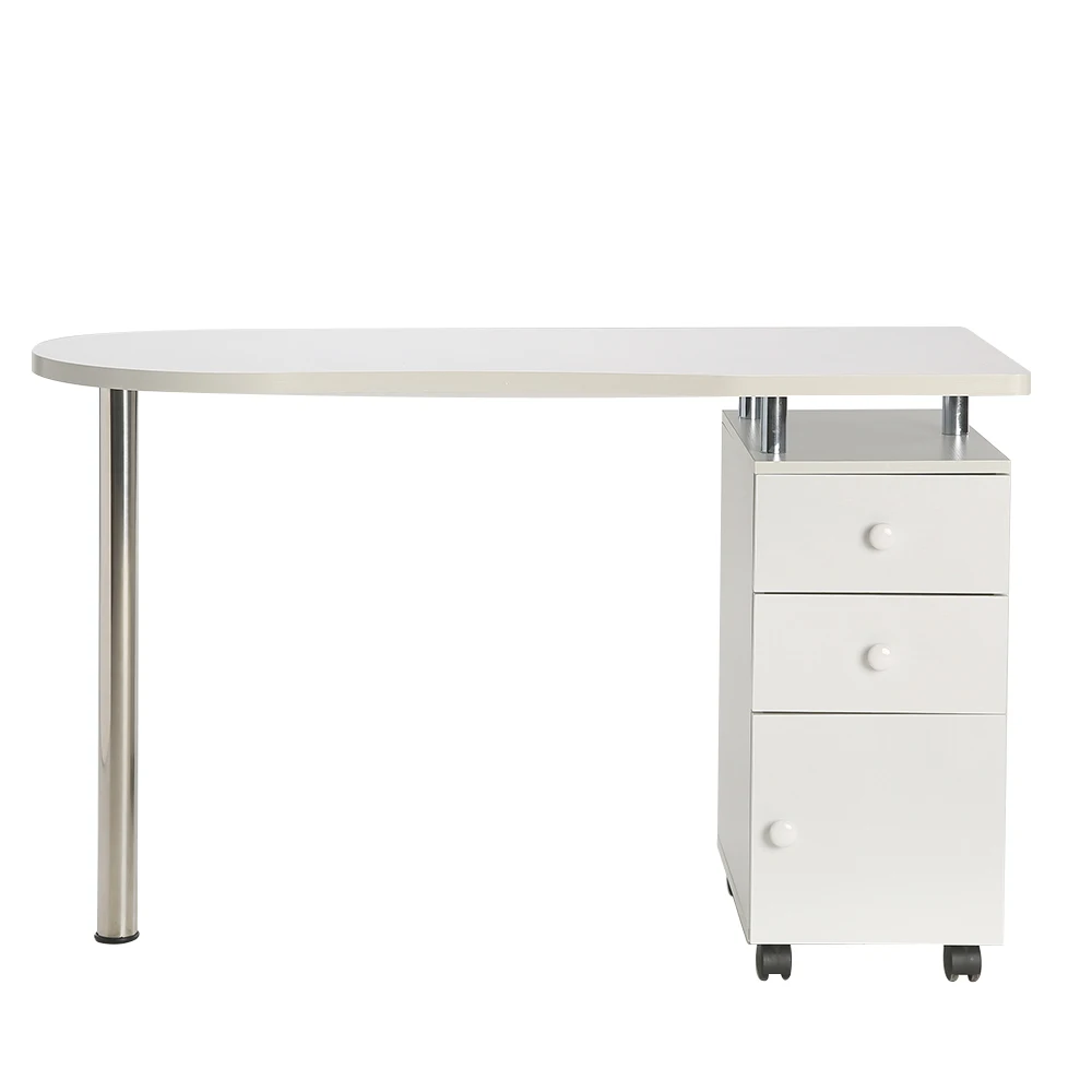 Маникюрный стол из ДСП с нишей для хранения и выдвижными ящиками. Изготовлен с использованием прочной никелевой фурнитуры, обеспечивающей бесшумное открывание ящиков. Тумбовая часть располагается с любой стороны.