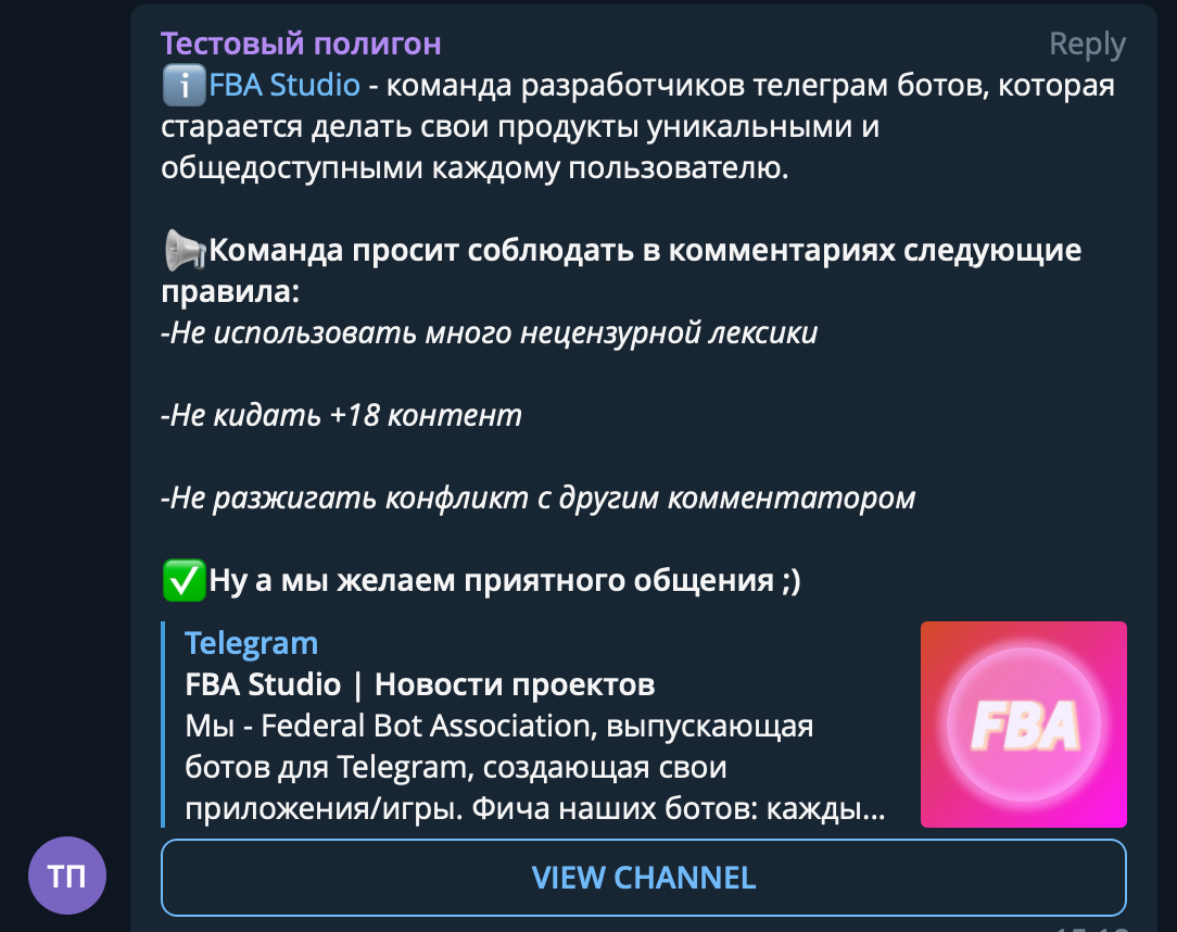 ℹ️<a href="https://t.me/FBA_Studio">FBA Studio</a> - команда разработчиков телеграм ботов, которая старается делать свои продукты уникальными и общедоступными каждому пользователю.