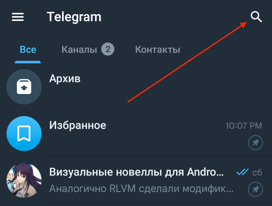 - Чтобы загрузить файл заново необходимо удалить повреждённый из кеша Telegram. Для этого перейдите на главный экран с чатами и нажмите на кнопку поиска вверху (рис. 3).