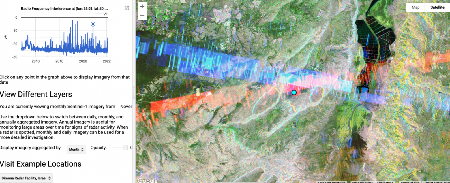 2. На графіку зліва показана історія радіочастотних перешкод (РФ) в місці, позначеному синьою крапкою в центрі карти. Червона і синя смуги на карті відповідають великим пікам на цьому графіку, які зазвичай вказують на наявність військового радара або іншого джерела перешкод С-діапазону. У цьому прикладі ми бачимо, що цей радар був включений десь в середині 2021 року. Наведення курсору на діаграму відобразить дату, коли зображення було зроблено, і натискання на діаграму завантажить зображення за цей період. Користувачі можуть завантажити діаграму, натиснувши кнопку праворуч від діаграми.