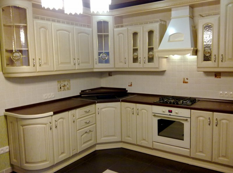 Такие радиусные кухни, фото которых представлено на нашем сайте, будут великолепно дополнять весь интерьер . Особенно красиво и дорого смотрятся модели с витражными стеклами .