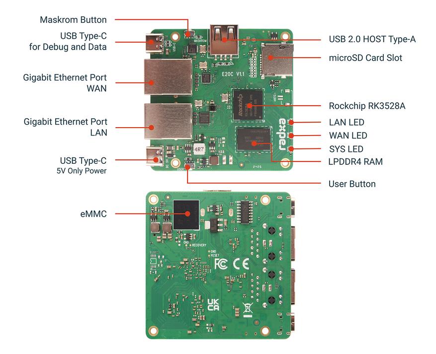 Также мини-ПК имеет три светодиодных индикатора, которые информируют о состоянии WAN, системы и LAN. На официальном сайте разработчика указано, что E20C совместим с Debian, OpenWrt и iStore OS. Мини-ПК предназначен для использования в качестве сетевого устройства: он может выполнять роль маршрутизатора, а можно использовать его для сборки персонального сервера.