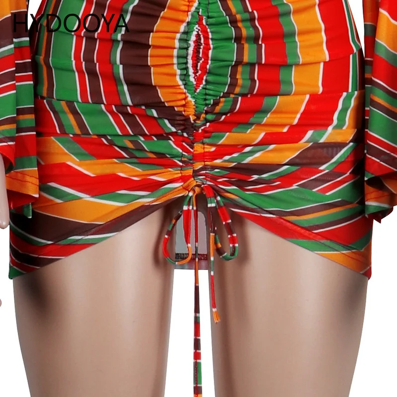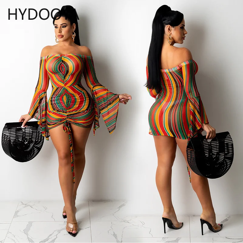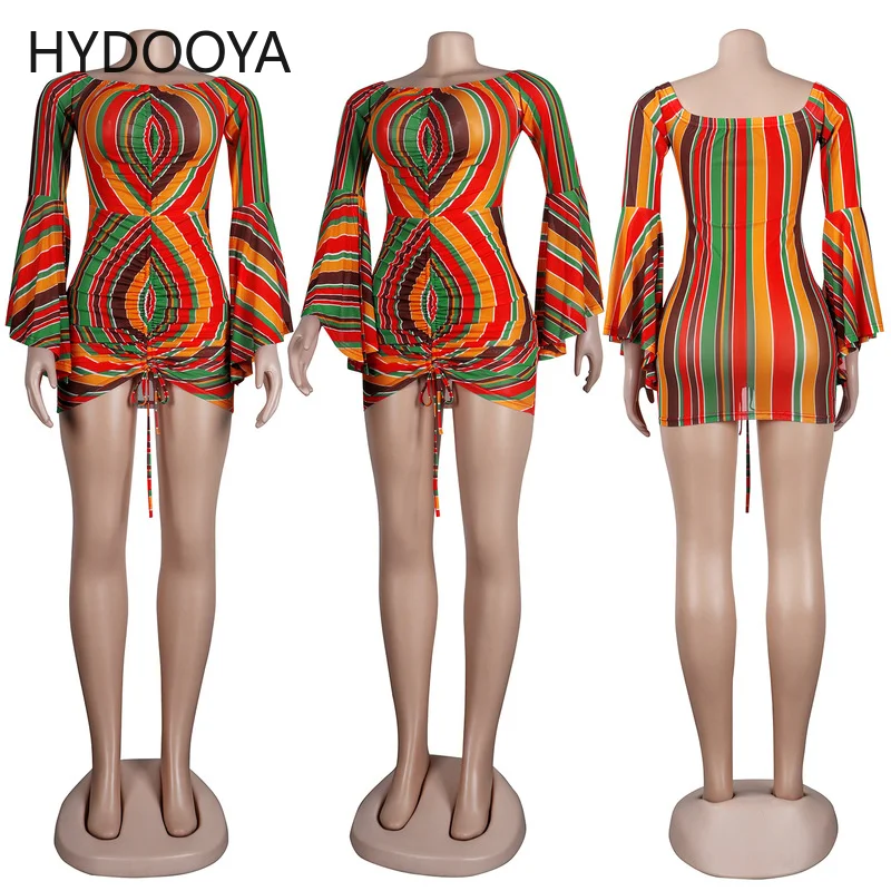 «Rainbow Striped Drawstring Ruched Wrap Dress Women Off The Shoulder Backless Bodycon Dresses Sexy Slash Neck Flare Sleeve Robe» по лучшей цене на рынке! Всего за 16$ (1520рублей)