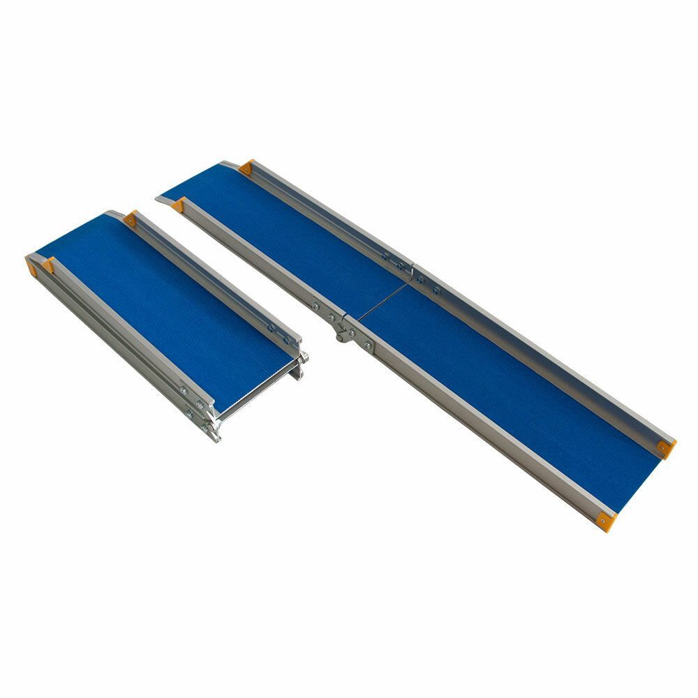 La rampe pliante MEGA PS2-300 est une conception universelle qui aide les personnes handicapées et autres personnes à mobilité réduite à franchir les escaliers et les seuils. Les rampes pliantes sont utilisées là où des structures permanentes accessibles ne peuvent pas être installées. Les rampes sont construites à partir de deux rampes pliantes, sont légères et mobiles et ne nécessitent aucune installation particulière. Les languettes des rampes ont une forme douce pour rouler et entrer confortablement dans la rampe. Le matériau principal pour la fabrication des rampes est l’alliage d’aluminium, qui répond aux exigences réglementaires. Étant léger, il peut supporter des charges importantes et résiste aux dommages mécaniques. CARACTÉRISTIQUES : Longueur : 300 cm Conception pliante Longueur pliée : 150 cm Largeur hors tout maximale (éléments saillants) : 24,3 cm Largeur de section externe : 22,3 cm Largeur interne : 18,2 cm Max. charge répartie - 400 kg Poids - 18,5 kg Couleur - bleu Portable, mobile - ne nécessite pas d'installation particulière Revêtement abrasif antidérapant Patins antidérapants