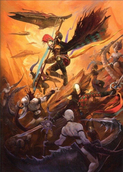 По ту сторону её встретила безумная сцена, зрелище из кошмара какого-то ненормального художника. Сотни демонеток плясали и резвились с трупами тёмных эльдар в броне, окрашенной в цвета личного кабала Векта. Служанки Той-Что-Жаждет кружились в безумном вальсе, словно на балу Сатаны, сжимая в любовных объятиях по мёртвому воину. Аккомпанировал им дуэт чудовищных флейтистов, игравших на бедренных костях эльдар мелодии из времён, что предшествовали грехопадению. Демонетки прямо в танце острыми клешнями сдирали кожу со своих партнёров: с каждым ласковым движением трупы оставались истекать кровью на полу. В центре всего этого находилась изящная танцовщица, державшая на длинной ручке маски трагедии и комедии. То была Маска Слаанеш, которой о побеге Иврайны сообщил потерявший от демоницы голову сслит, ветеран Шассарасен.