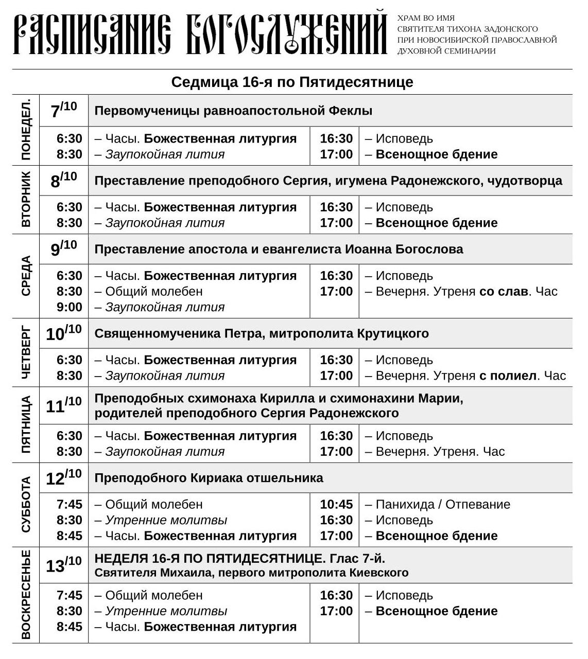Расписание служб в приходе