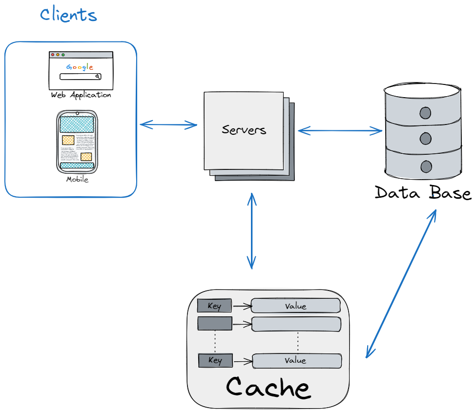 Для небольших приложений такой архитектуры достаточно. Но по мере роста числа пользователей у нас растет и нагрузка на базу. Что приводит ухудшению производительности приложения. В таком случае можно добавить в систему кэш. Кэш хранит данные в оперативной памяти, что позволяет ускорить процесс чтения данных. Оперативная память дороже SSD или HDD, поэтому в кэше, обычно, хранится только часть наиболее часто используемых данных из базы. Вначале, сервер читает данные из кэша. Если они там есть (cache hit), то данные возвращаются из кэша. Если их там нет (cache miss), то данные читаются из базы.
