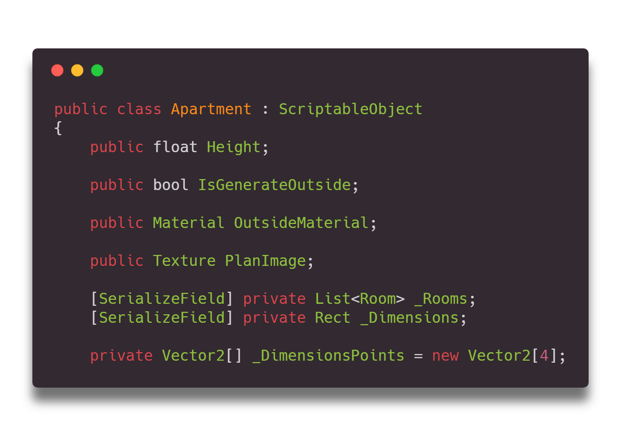 Едем дальше. Помимо отдельного окна для отрисовки чертежей нам надо как-то хранить сами чертежи. Для этого отлично подходит внутренний механизм сериализации Unity – Scriptable Object. По сути, он позволяет хранить описанные классы в виде ассетов в проекте, что очень удобно и нативно для многих юнити разработчиков. Для примера, часть класса Apartment, которая отвечает за хранение информации о планировке в целом