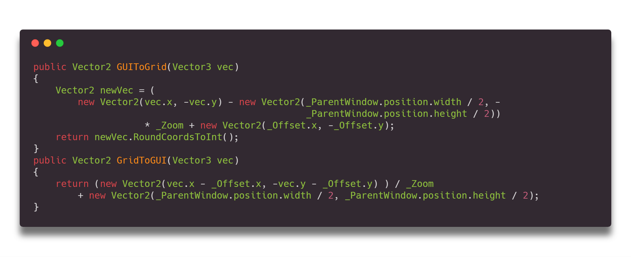 Вот тут открылось сразу несколько проблем. Первое, необходимо было ввести свою систему координат. Дело в том, что для корректной и удобной работы нам надо пересчитывать GUI координаты окна в координаты грида. Для этого были реализованы два метода преобразования (в сущности, это две расписанные TRS матрицы)