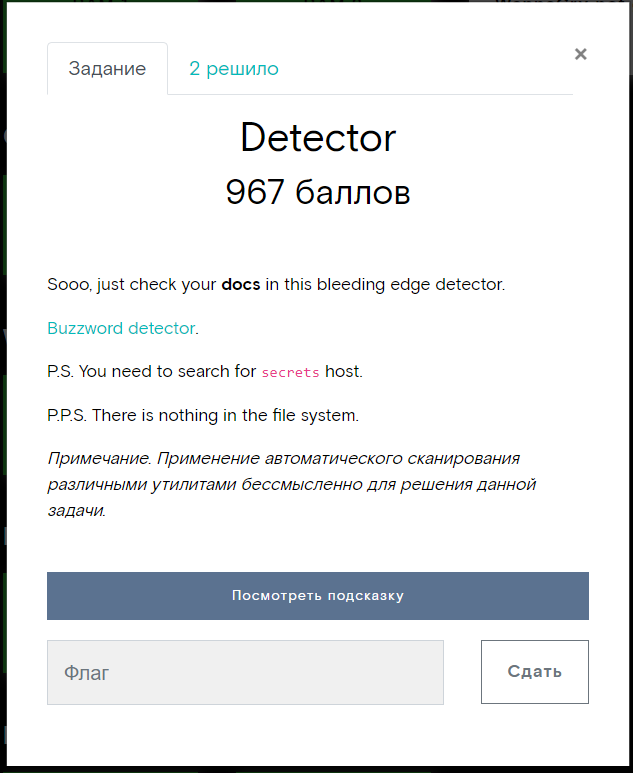 Открываем задание, видим выделенное жирным docs, подсказку с secrets (запоминаем) и кнопку хинта, он пригодится позже.