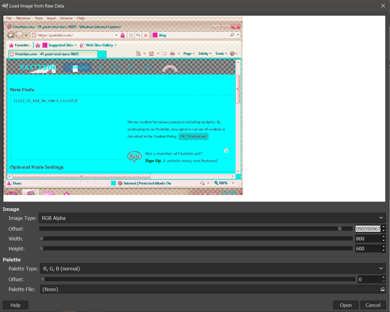 Открываем гимп, и по смещению в 1090590967 находим искомую картинку с флагом.