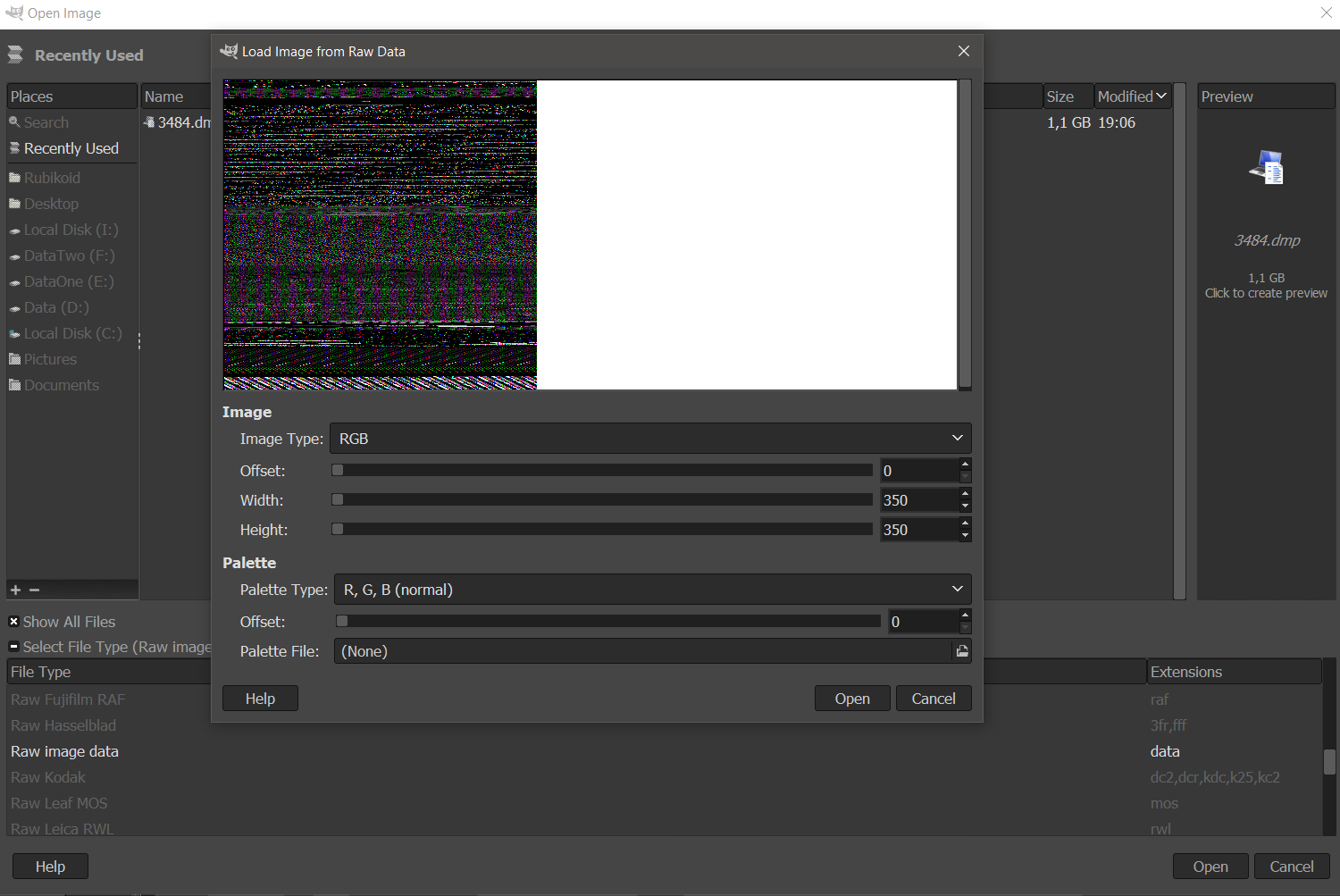 Открываем в gimp'е, выбираем raw image и открываем картинку