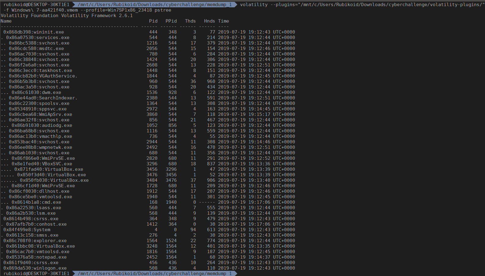 Дальше проверяем pstree, из интересного видим запущенный notepad и Virtualbox.