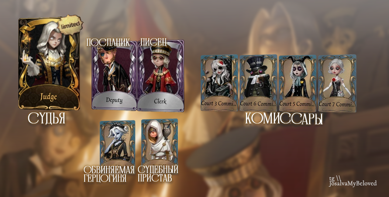 Персонажи в сущности играют судей и ответчиков «Семи смертных грехов». Был создан специальный трибунал на основе структуры судебного органа того времени. Трибунал состоял из главного судьи и комиссаров каждого трибунала. Каждый комиссар соответствовал семи видам грехов, и они сами были воплощениями этих семи видов грехов. Поэтому ссылкой для их судов является не закон, а то, набожен обвиняемый или нет в «вере».