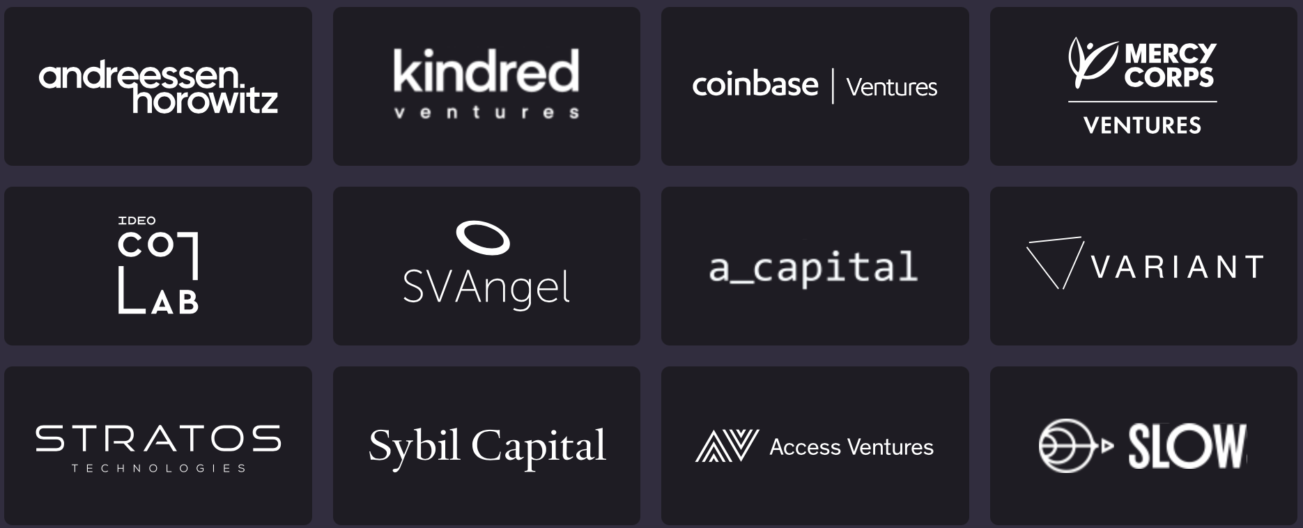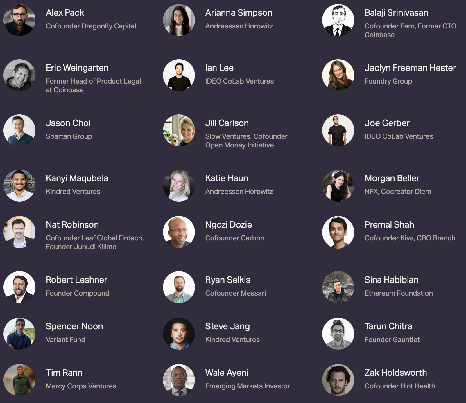 К ним относятся: Kindred Ventures, Coinbase Ventures, IDEO CoLab Ventures, Straatos Technologies, Alex Pack (соучредитель Dragonfly), Эрик Вайнгартен (бывший глава отдела отдела продуктов Coinbase), Джесси Уолден (Variant Fund), Джилл Карлсон (Slow Ventures, соучредитель Open Money Initiative), Морган Беллер (создатель Diem), Премал Шах (соучредитель Kiva), Роберт Лешнер (основатель Compound), Спенсер Нун (Variant Fund) и Тарун Читра (основатель Gauntlet) и другие.