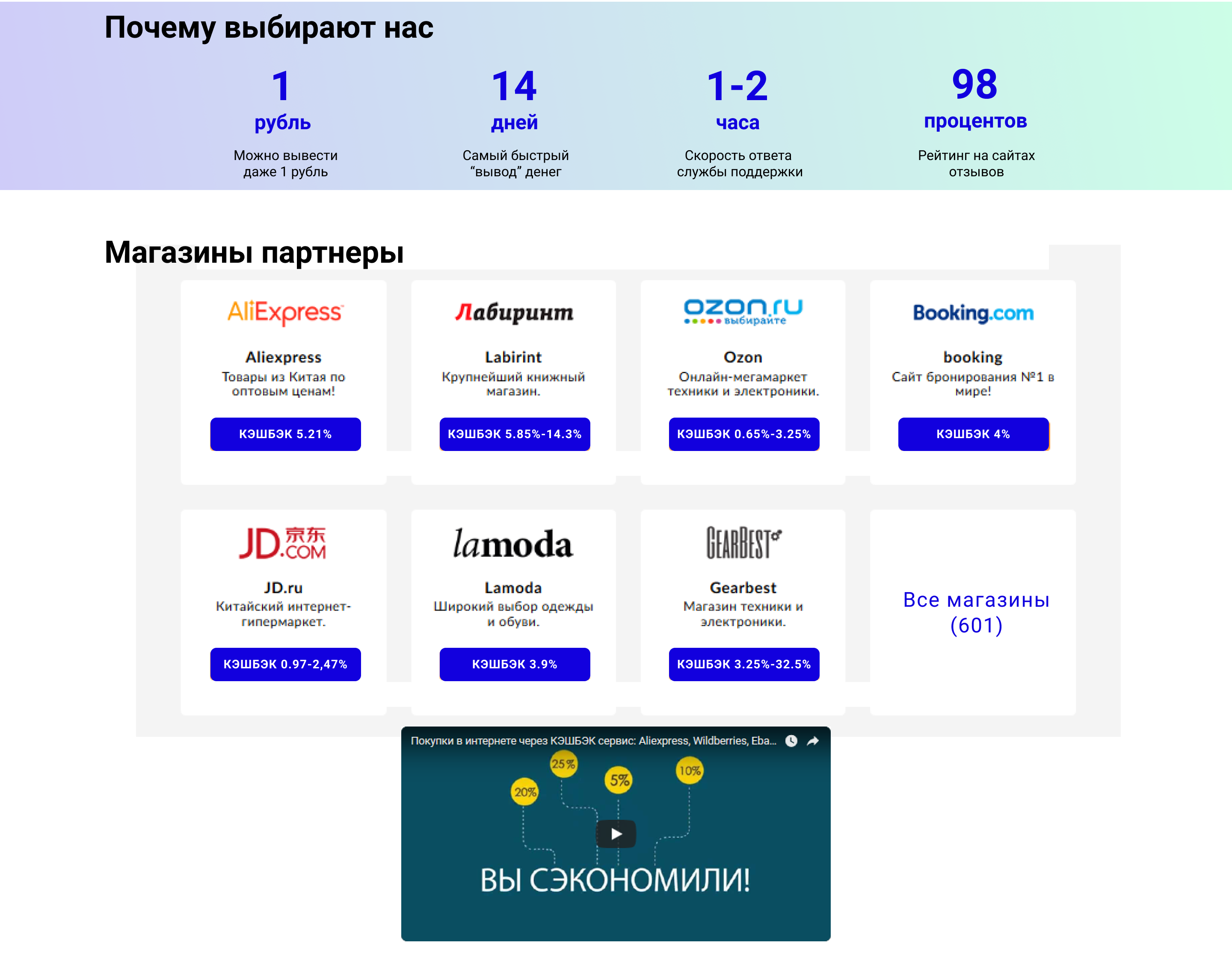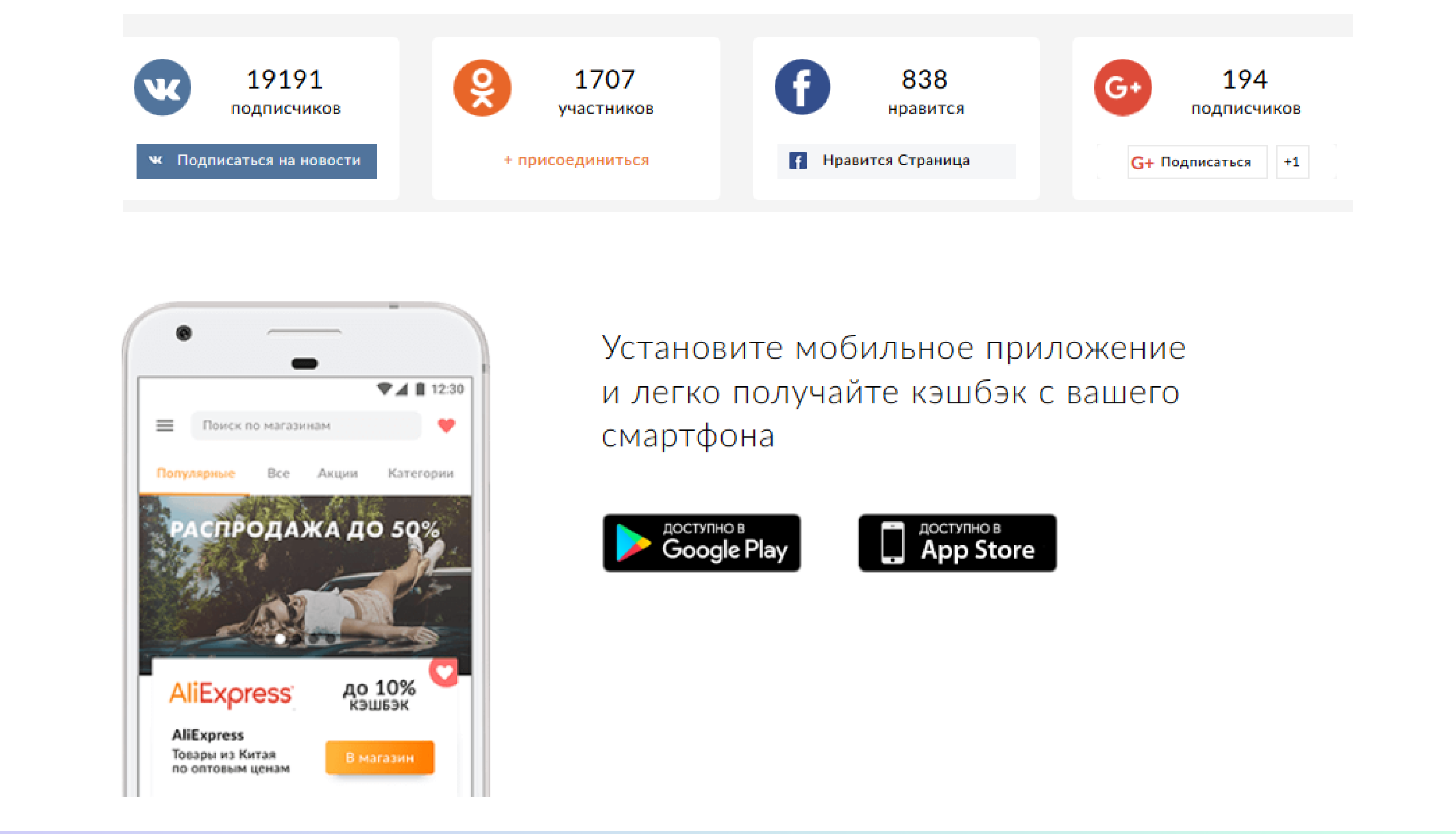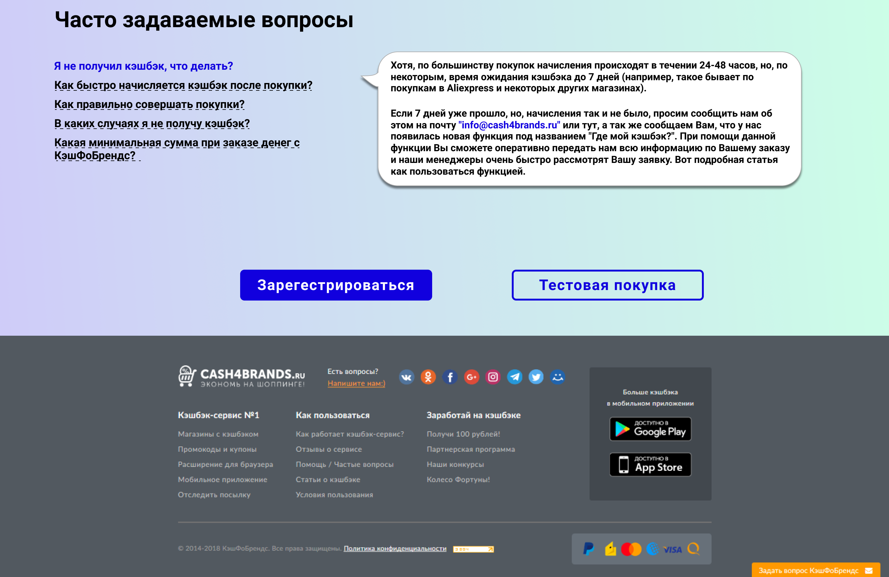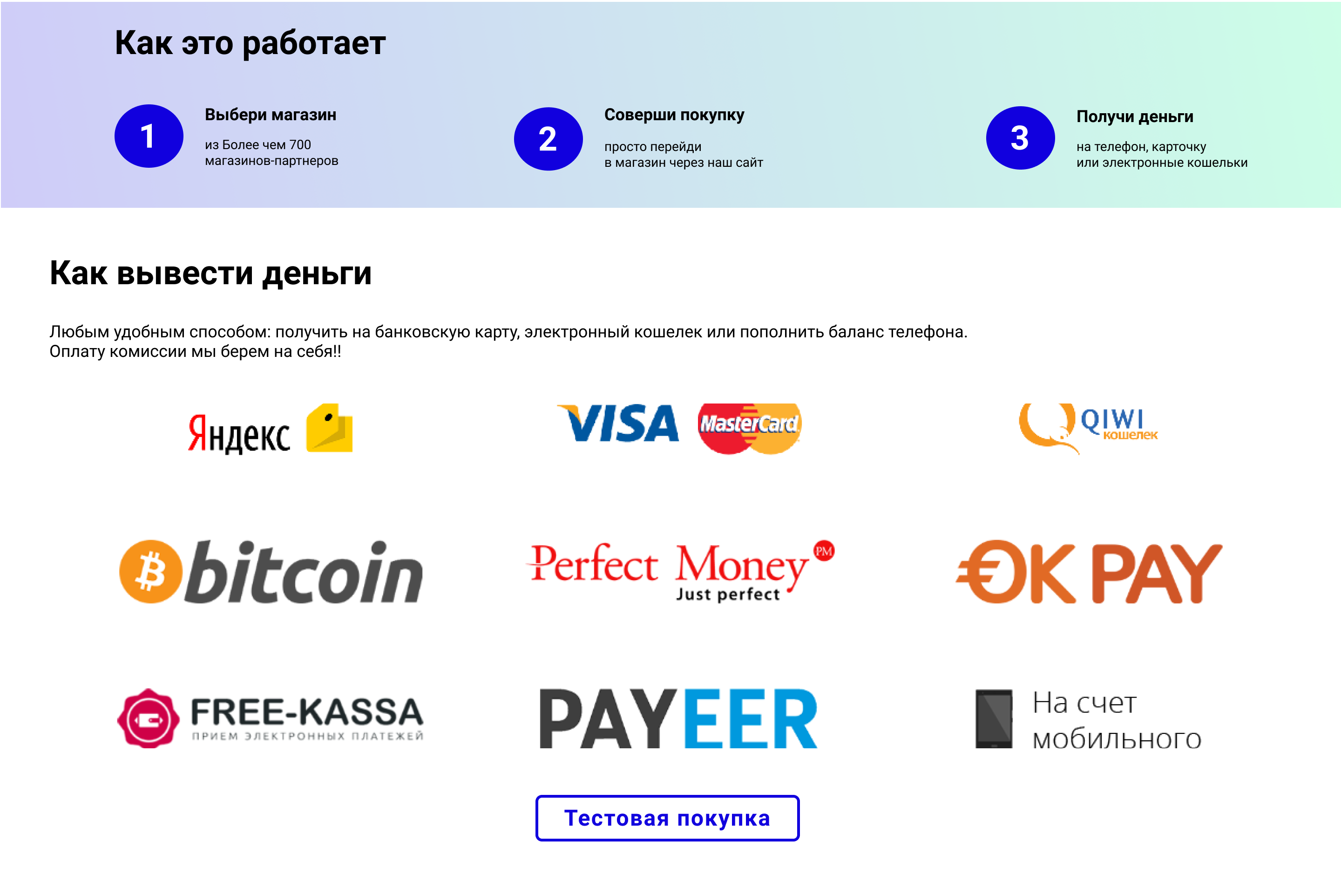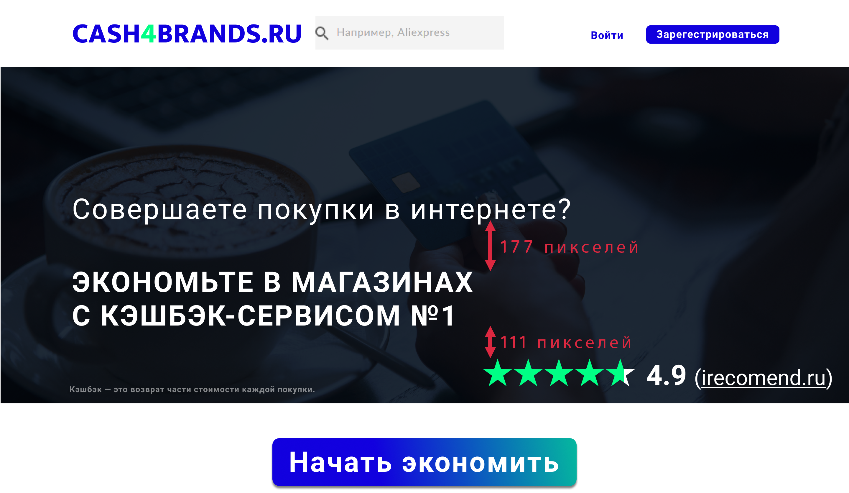 Например написать так: "Совершаете покупки в интернете? Возвращайте часть от их стоимости с кешбэк-сервисом №1". Таким образом убиваем двух зайцев: и надпись снизу убрали, и в целом текста на экране стало меньше, осталось лишь самое главное.