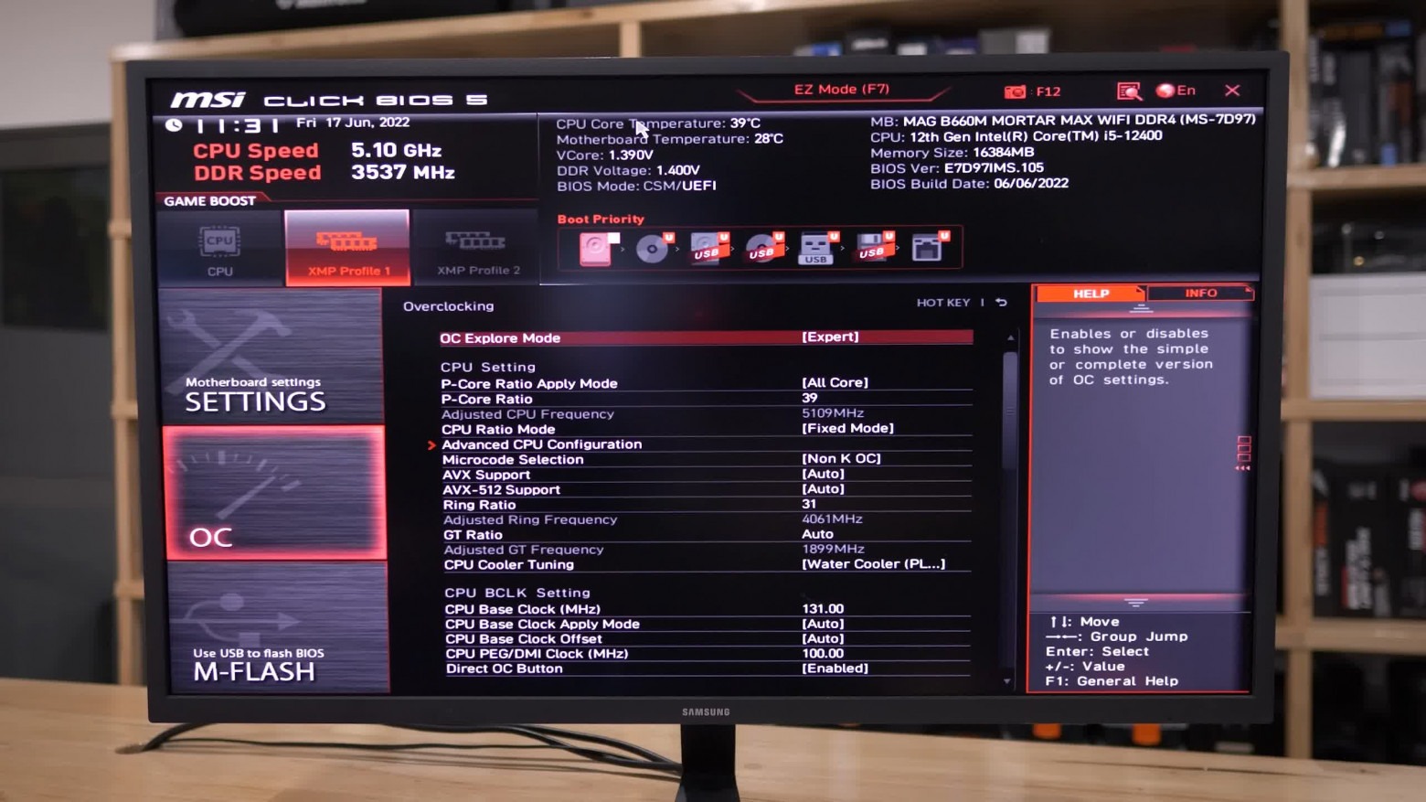 Мы разогнали Core i3-12100, i5-12400 и i7-12700 до частоты всех ядер 5,1 ГГц и частоты кольцевой шины 4,1 ГГц. Коэффициент P-Core был установлен на x39 с режимом fixed mode, был включён микрокод разгона процессоров без K, параметр Ring ratio был установлен на x31, а базовая частота (base clock) ЦП — на 131 МГц.