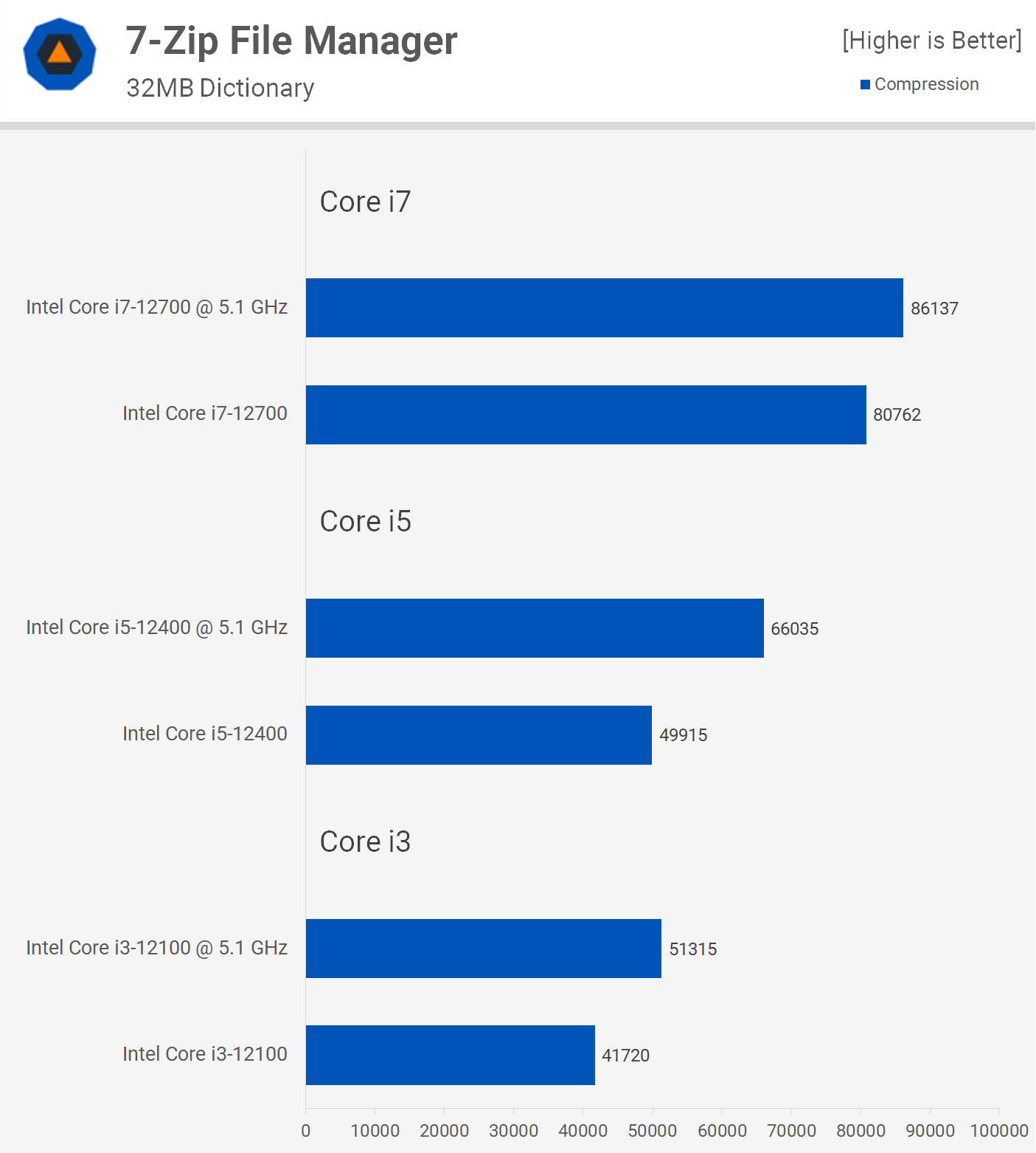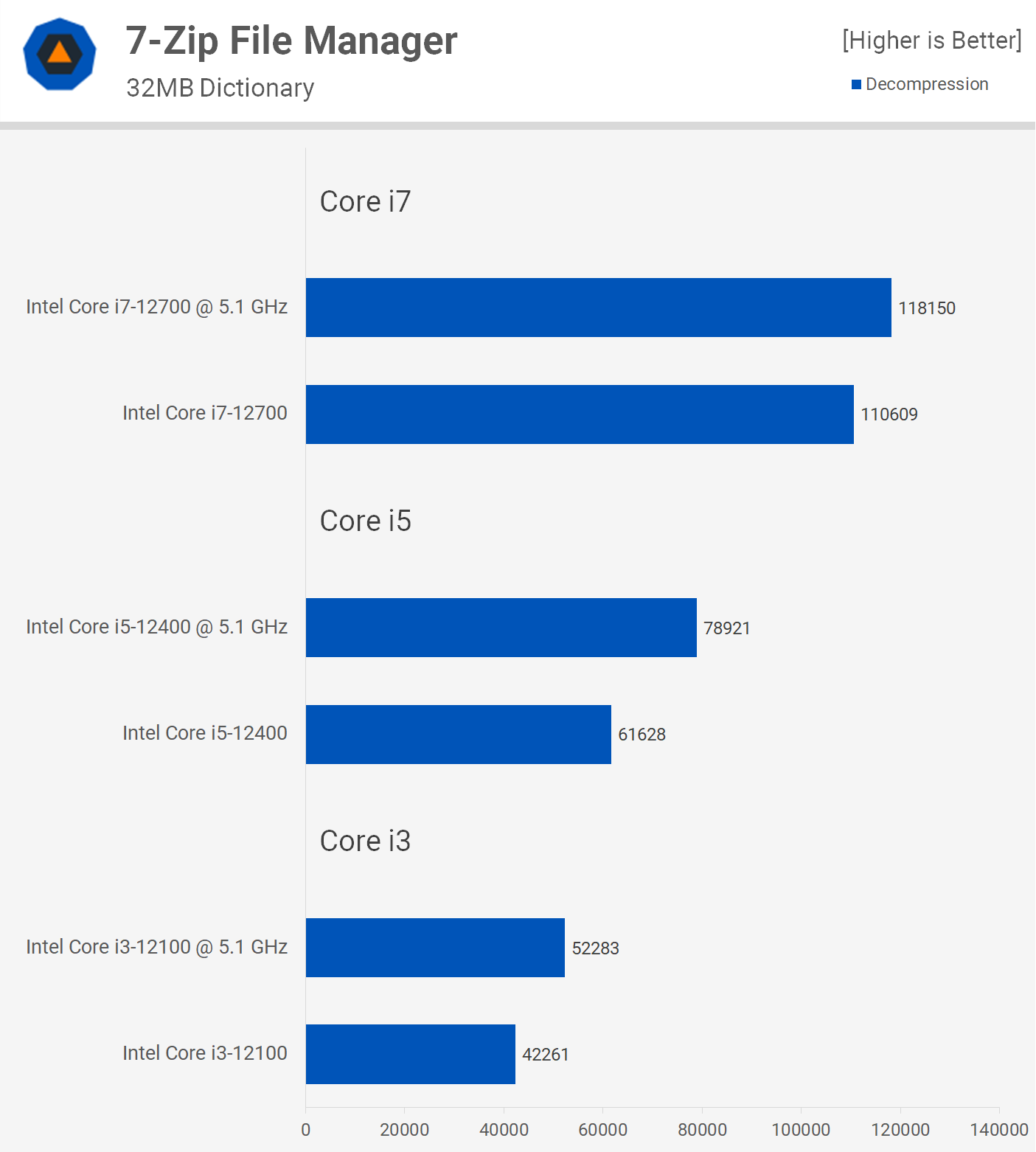 Тест 7-Zip File Manager тоже показал повышение в 23% в производительности сжатия 12100 и целых 32% для 12400. Результаты 12700 впечатляют меньше, всего 7%.