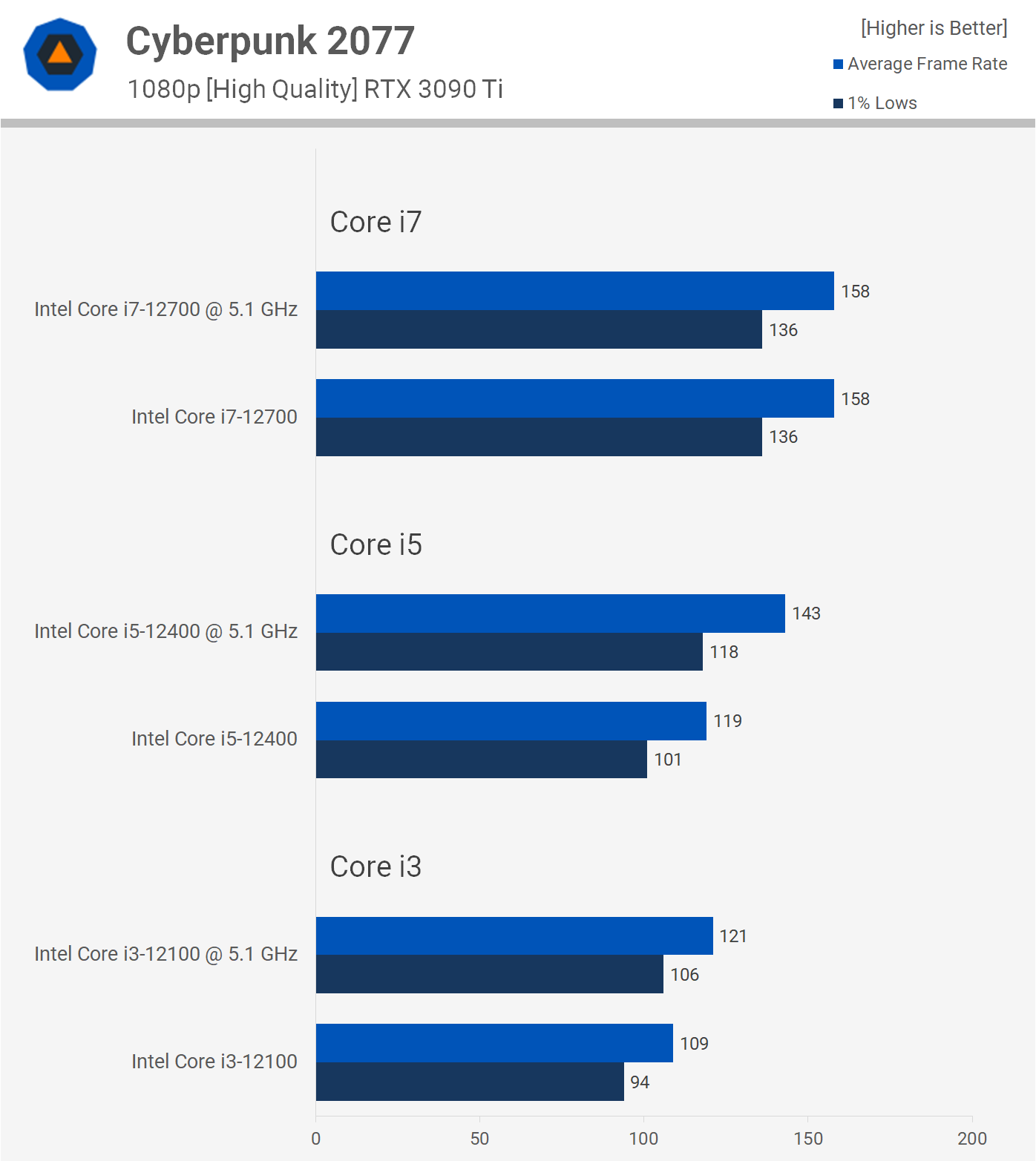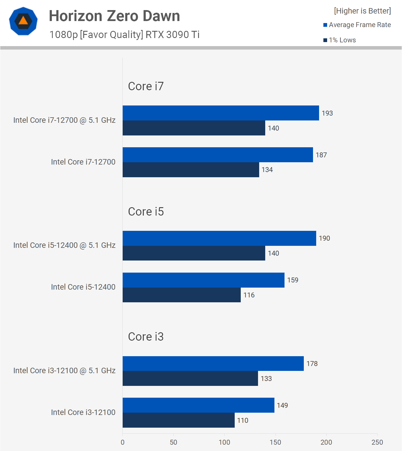 Core i3-12100 изначально неплохо проявлял себя в Horizon Zero Dawn, однако после разгона частота кадров увеличилась ещё на 19% (до 178 fps), что лишь на 5% меньше, чем у 12700 без разгона. 12400 тоже добился повышения производительности на 19% (до 190 fps) и его скорость почти достигла уровня Core i7.