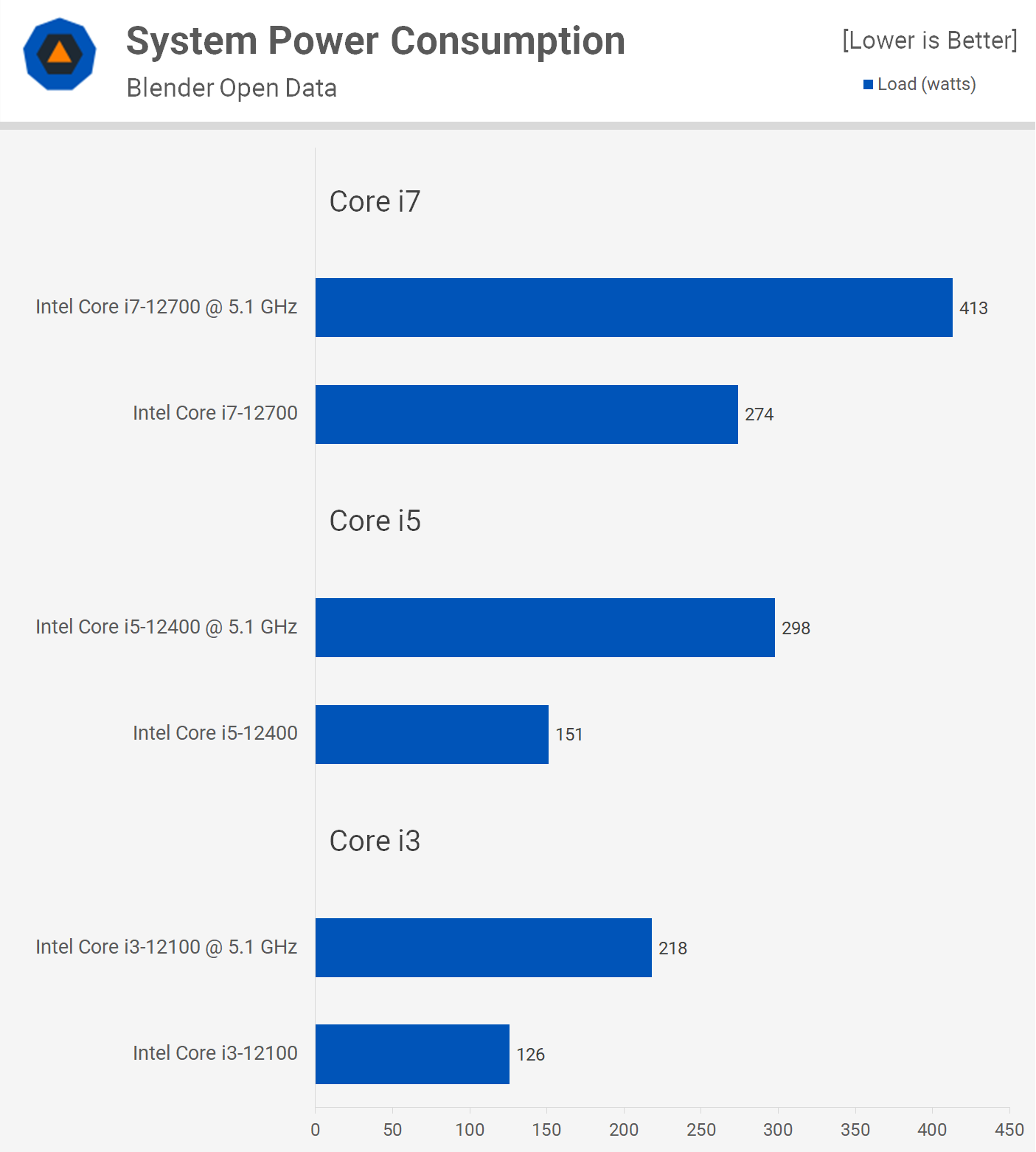 Так как мы не настраивали напряжения для разгона, энергоэффективность ужасна, по сравнению с исходными показателями она упала почти вдвое. Наш i5-12400 не был стабилен на 1,29 В, и общее энергопотребление системы всё равно составило 266 Вт, то есть по сравнению с 1,39 оно снизилось всего на 11%, поэтому мы не стали точно настраивать напряжения для этого тестирования.