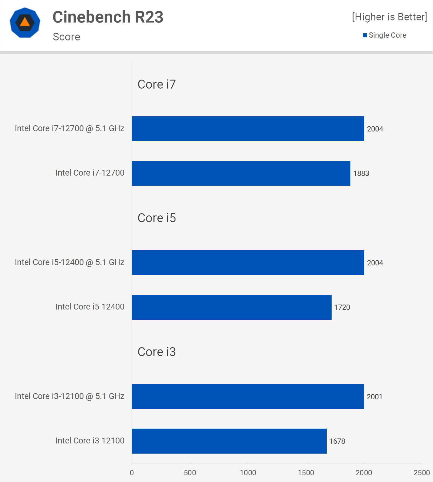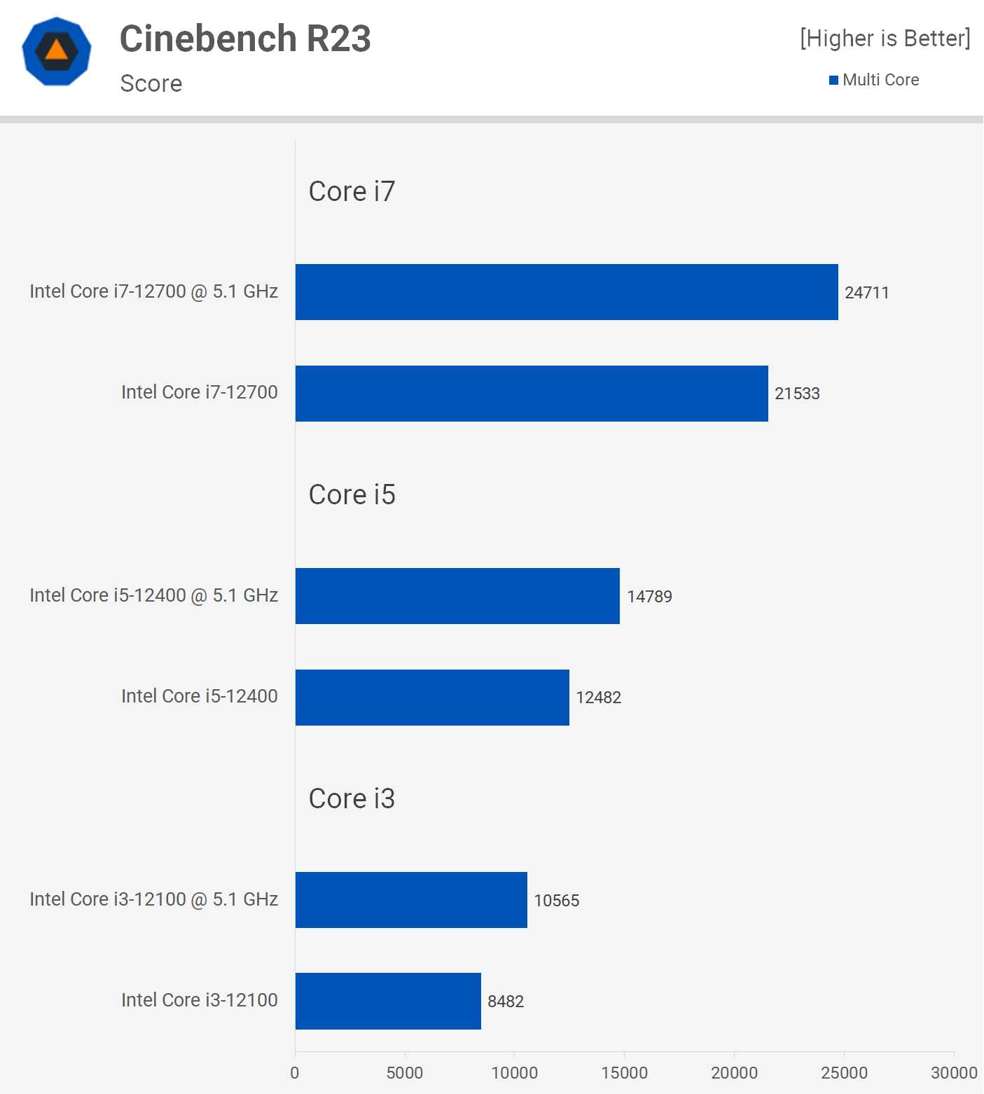 Бенчмарк Factorio использует только одно ядро и на него сильно влияет производительность кэша. 12100 получил рост производительности на 26%, 12400 — на 27%, а 12700 — на скромные 6%. Большой рост производительности моделей Core i3 и i5 в основном связан с тем, что они имеют низкие тактовые частоты «из коробки».