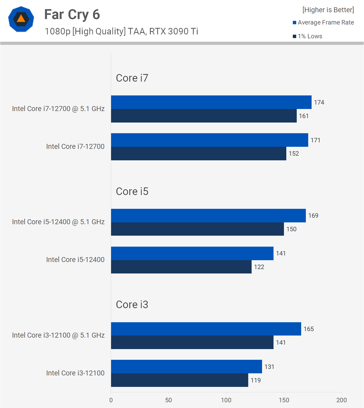 В Far Cry 6 мало используется многопоточность, поэтому игра сильно зависит от одноядерной производительности. Поэтому при разгоне 12100, 12400 и 12700 мы получили очень близкую производительность, модели Core i3 и i7 отличаются лишь на 5%.