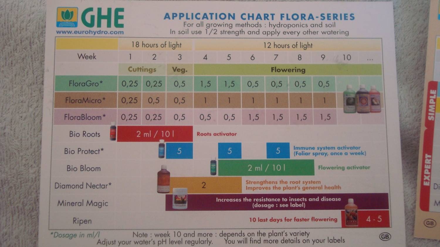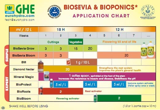 В комплект GHE Flora Series входят три бутылочки - Flora Grow, Flora Micro и Flora Bloom. У каждой из них свой состав, и смешивать их нужно в различных пропорциях на разных этапах жизненного цикла.